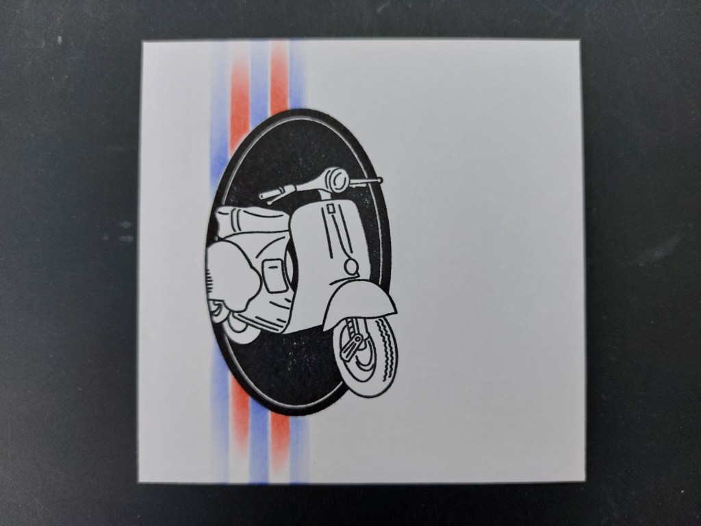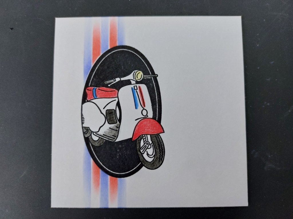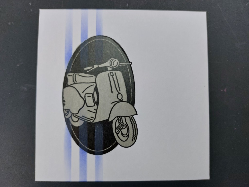 I started by stamping the scooter silhouette with black Archival onto a 4″ square of stencil card. I cut a mask for it frm Clarity’s reusable mask material, covered it over and sponged ‘blueprint sketch’ Distress Oxide through the thin stripes stencil. (I used a sponge, rather than a brush, as I only wanted a few lines from the stencil.) Keeping the mask in place, I moved the stencil across and added a couple of red stripes with ‘festive berries’.