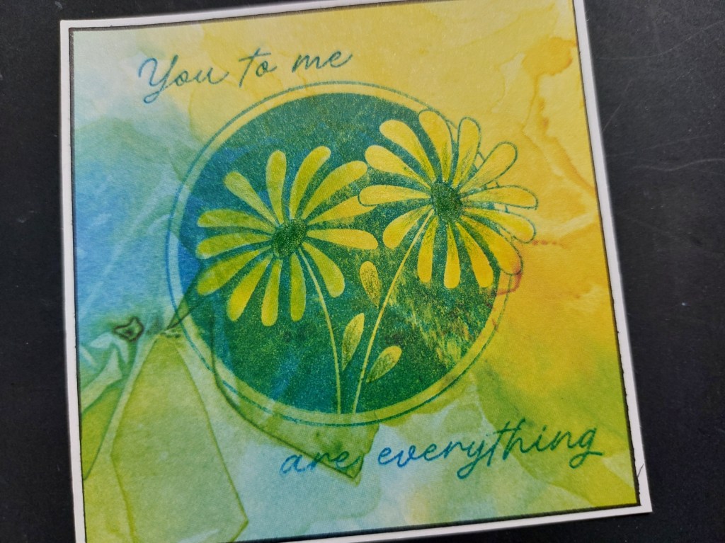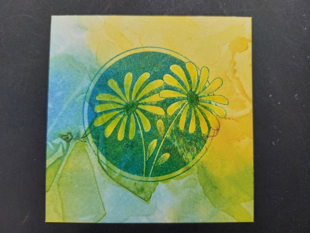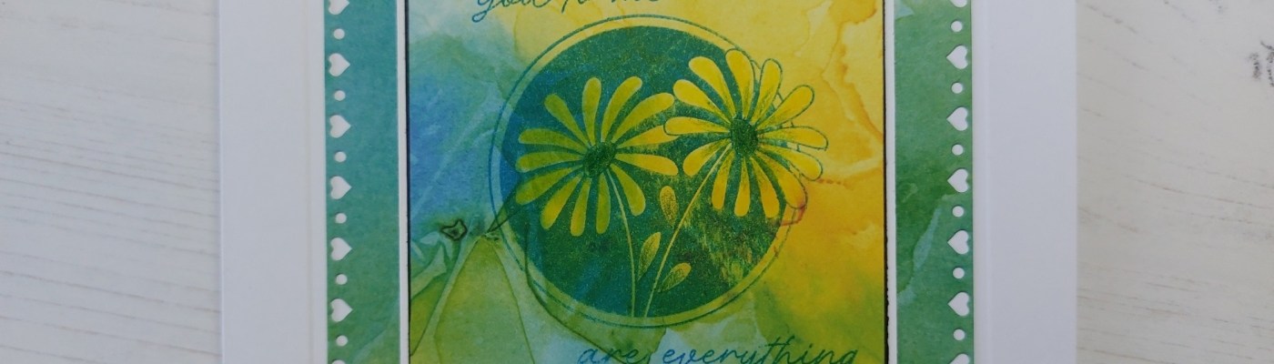 Well the sunshine is back here today, so I thought I’d share some summery flowers with you, using another of the new silhouette images from ClarityCrafts – these daisies are in the ‘just flowers silhouette frames’ set. I’ve teamed them up with a piece of Clarity’s Waimea Falls designer paper, which picks up the two greens, light blue and yellow from Color Dare‘s grid, plus the ‘summertime’ option from Love those pretty papers