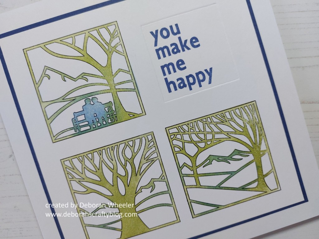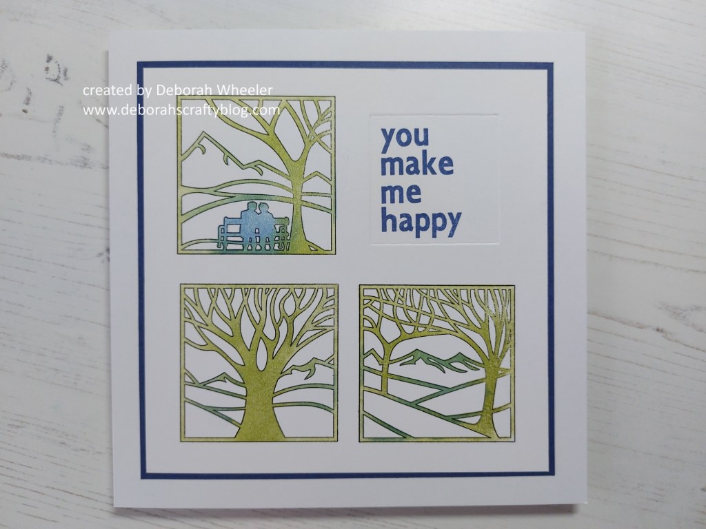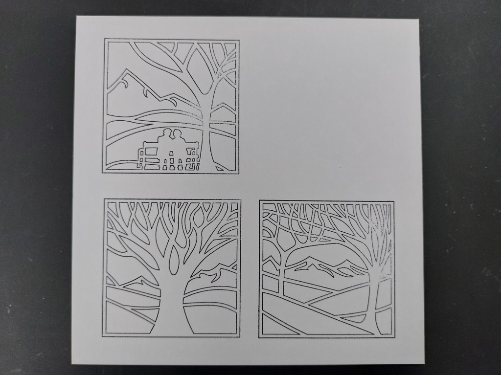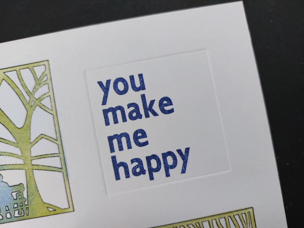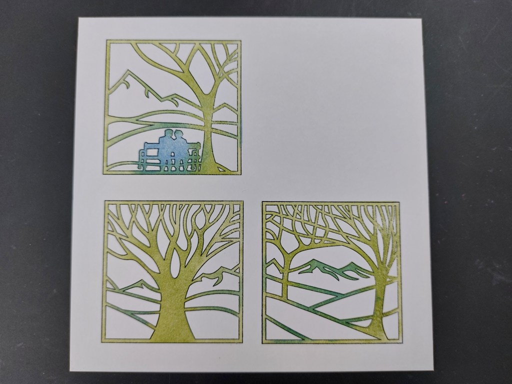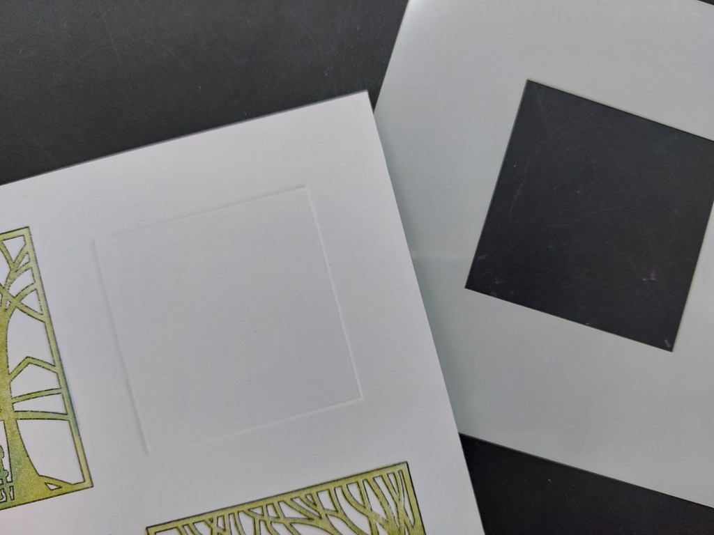 I’ve used three of the four images on this card and stamped the outlines on a piece of stencil card that I’d cut to fit on a 7×7 card blank. As with yesterday’s design, I placed the first stamp where I wanted it on the card then picked it up on a small mega mount, aligning the marking with the edges of the card so I could stamp straight down in the same place. I could then space the other two images in the same way.