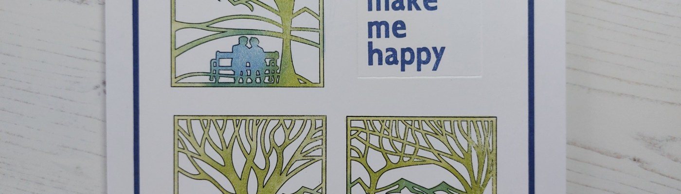 I’ve used three of the four images on this card and stamped the outlines on a piece of stencil card that I’d cut to fit on a 7×7 card blank. As with yesterday’s design, I placed the first stamp where I wanted it on the card then picked it up on a small mega mount, aligning the marking with the edges of the card so I could stamp straight down in the same place. I could then space the other two images in the same way.