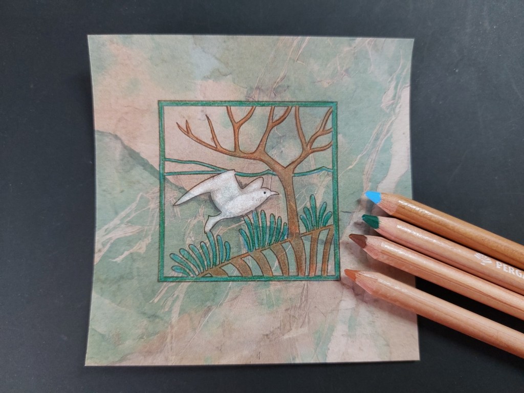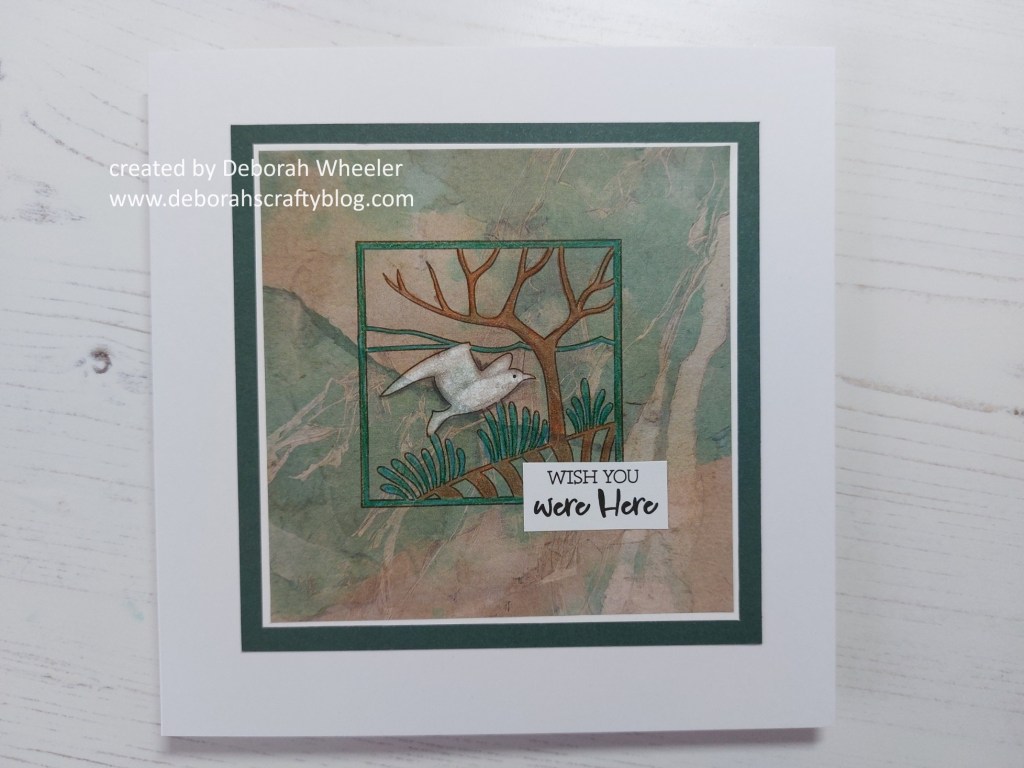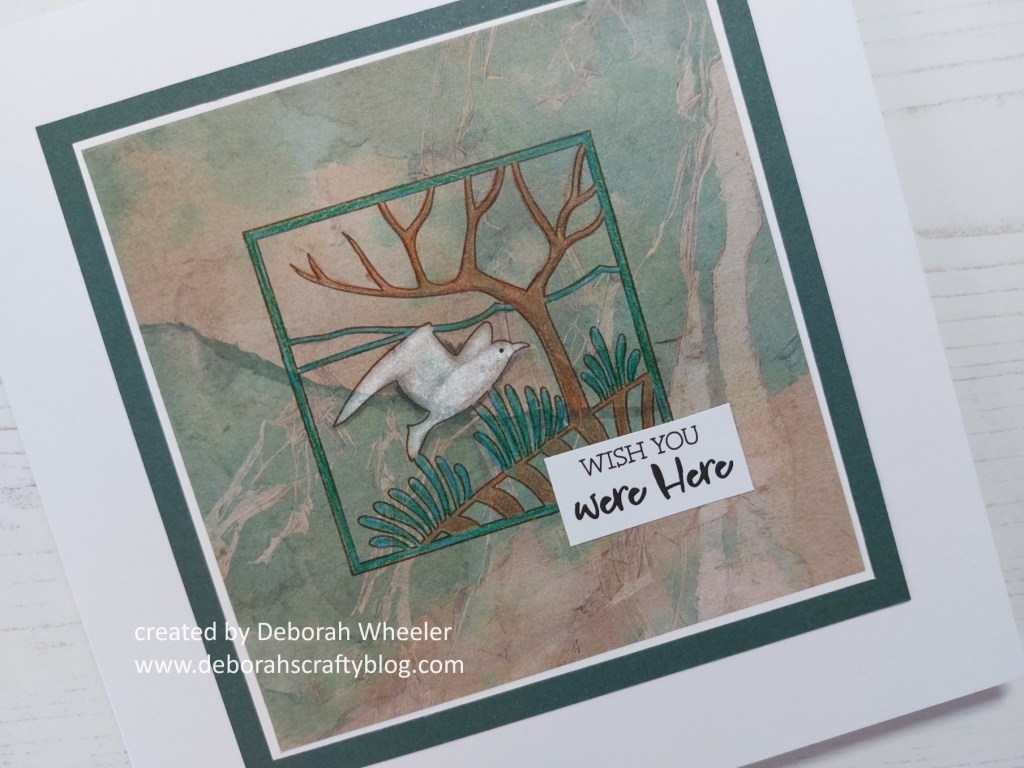 As I’d taken the colour out of the bird, I didn’t want to use the infill stamp for the rest of the image, so instead used a couple of brown pencils for the tree and ground and blended the turquoise and dark green pencils to add the teal in around the frame and on the plants.