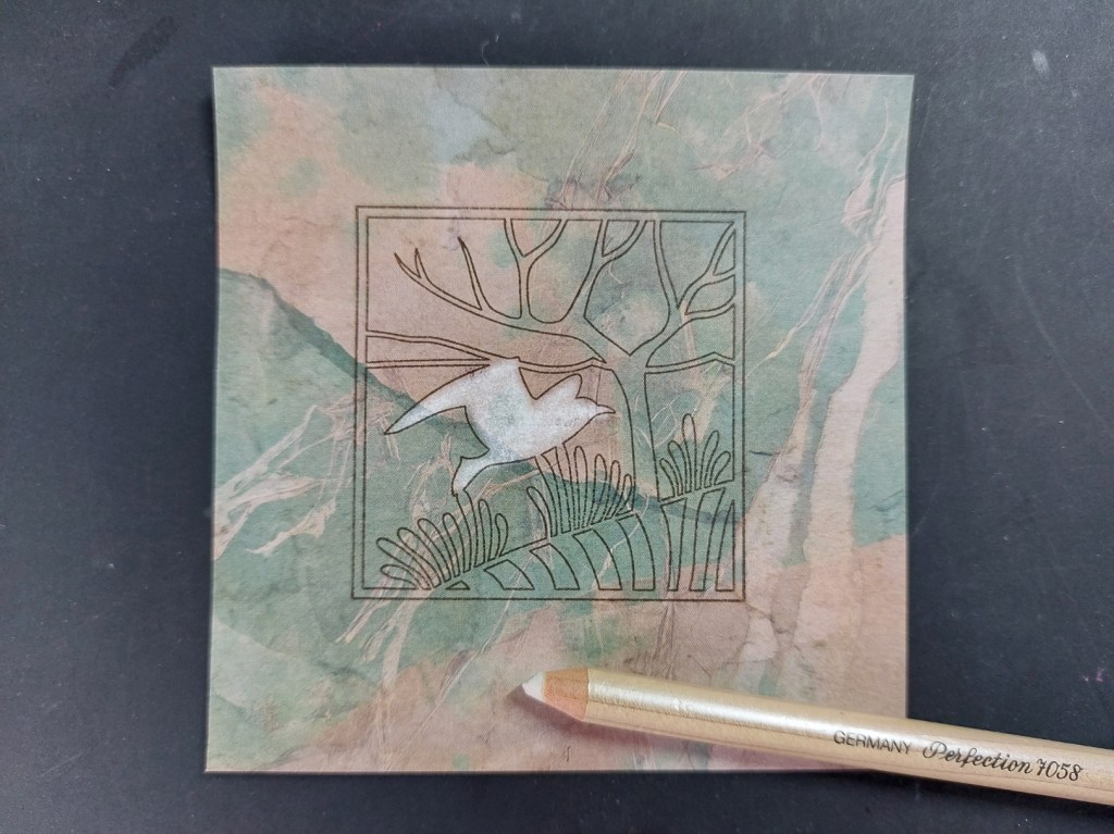I started by cutting a piece of the ‘peppermint’ infusion papers to fit a 6×6 card blank, stamping the outline of image 2 into the centre using ‘potting soil’ Archival ink. I then took a Faber Castell eraser pencil to the bird, to lift the colour out of the paper (this technique never ceases to amaze me!) It’s the only way to get a soft white onto a coloured paper – a white pencil wouldn’t show up on the background.