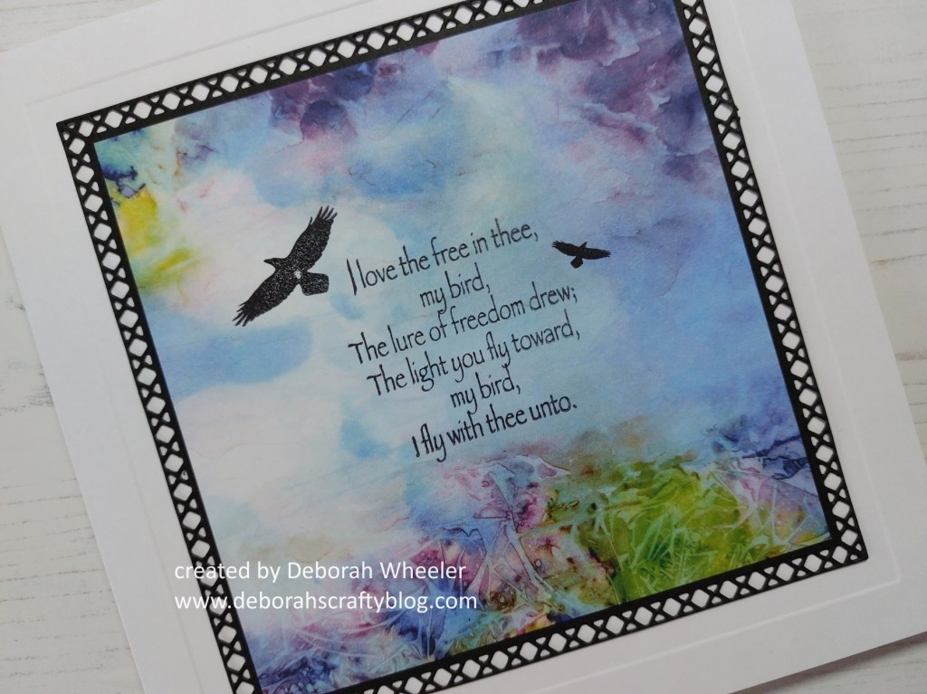 Welcome to my crafty blog and a little more inspiration to share with you from last weekend’s ClarityCrafts TV shows. It’s another take on the ‘wild frame’ stamp set – and this one’s got a very different vibe from Sunday’s! I just felt that the Antarctica designer card was the perfect background for these eagles heading off into the skies (and another one that evokes memories of my recent trip to western Canada!) I’m also going to share this with Triple B for the ‘birds’ aspect of their challenge and with Word Power, a new-to-me that challenge that looks for sentiments to be the main focus of the card.