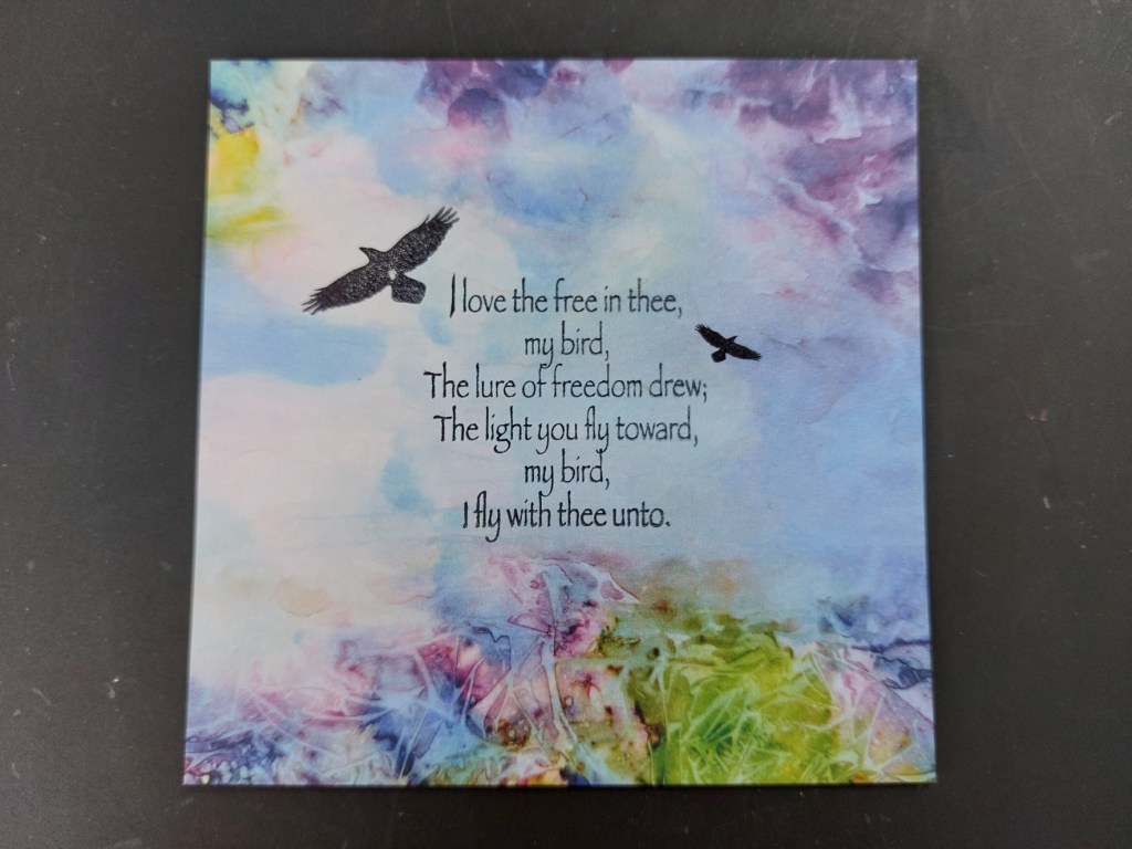 So, I took a piece of the Antarctica 5×7 designer card and cut it down into a square. I then simply stamped the poem and two birds into the card using black Archival ink.