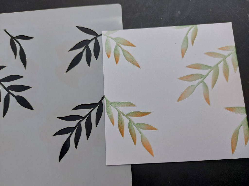 So here’s a quick run through on what I did. I started with the first stencil on a 5×5 piece of card and ran it through my embossing machine to give the leaves dimension. I then brushed ‘rustic wilderness’ DistressOxide across the stencil and sponged ‘ripe persimmon’ around the edges of the leaves. I swtiched to the second stencil and repeated the colours again, but didn’t run this one through the embossing machine. Then onto the third stencil and repeat the process.