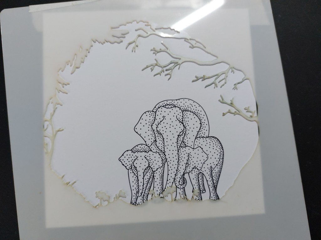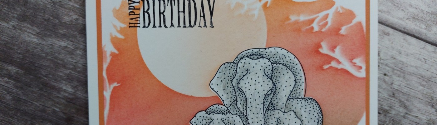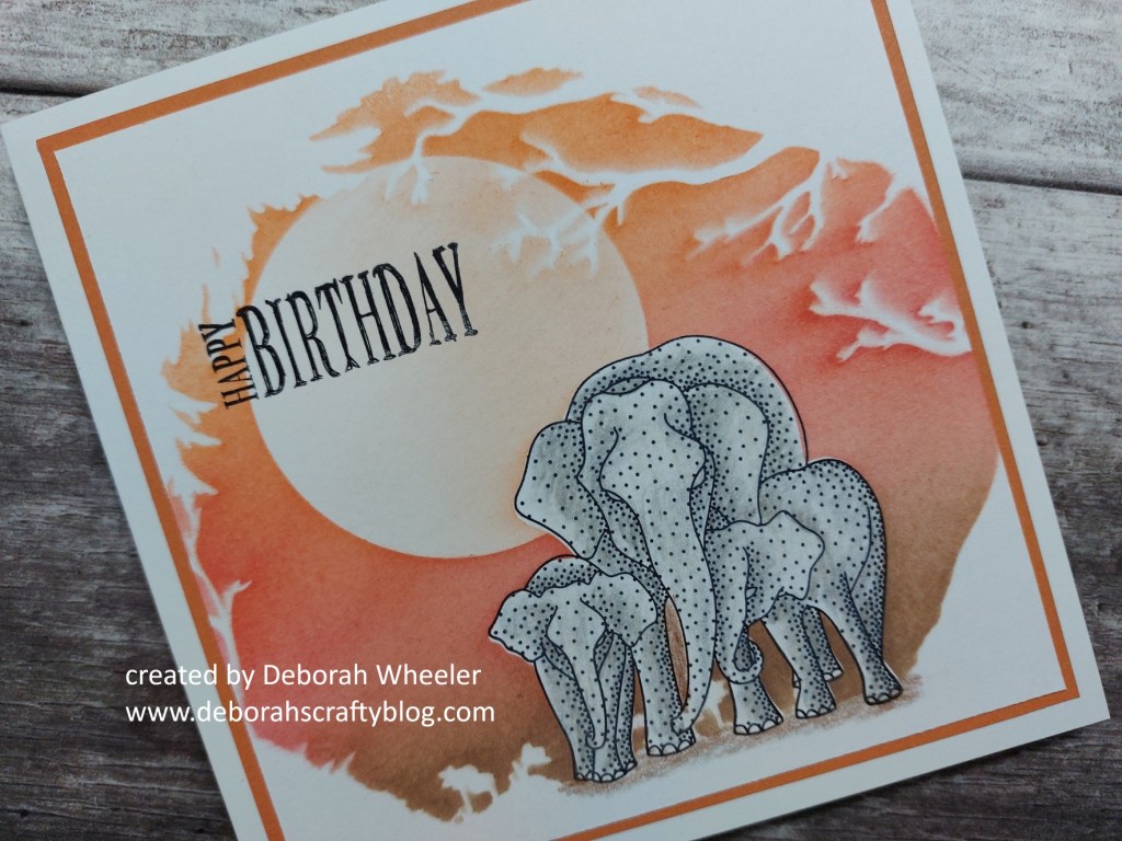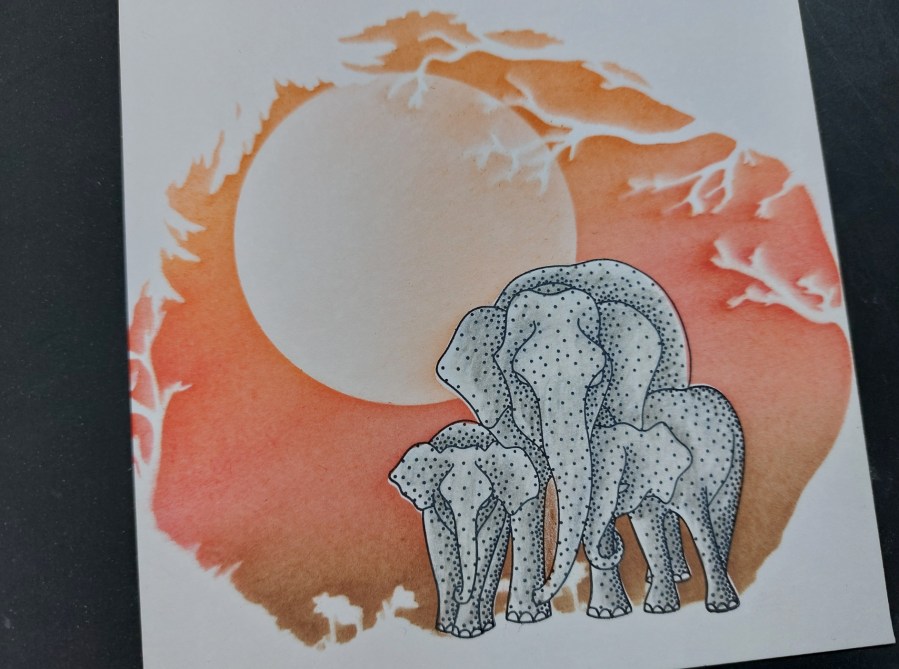 I cut a piece of stencil card to fit a 6×6 card blank, lined the ‘woodland’ stencil up on it with a hinge of low tack tape, then stamped the elephants so their feet sat along the edge of the stencilled area (lift the stencil up to do this!) I’d cut a mask for the elephants, so covered them with that then added a large circle mask for the sun, making sure it sat underneath the branches on the stencil.