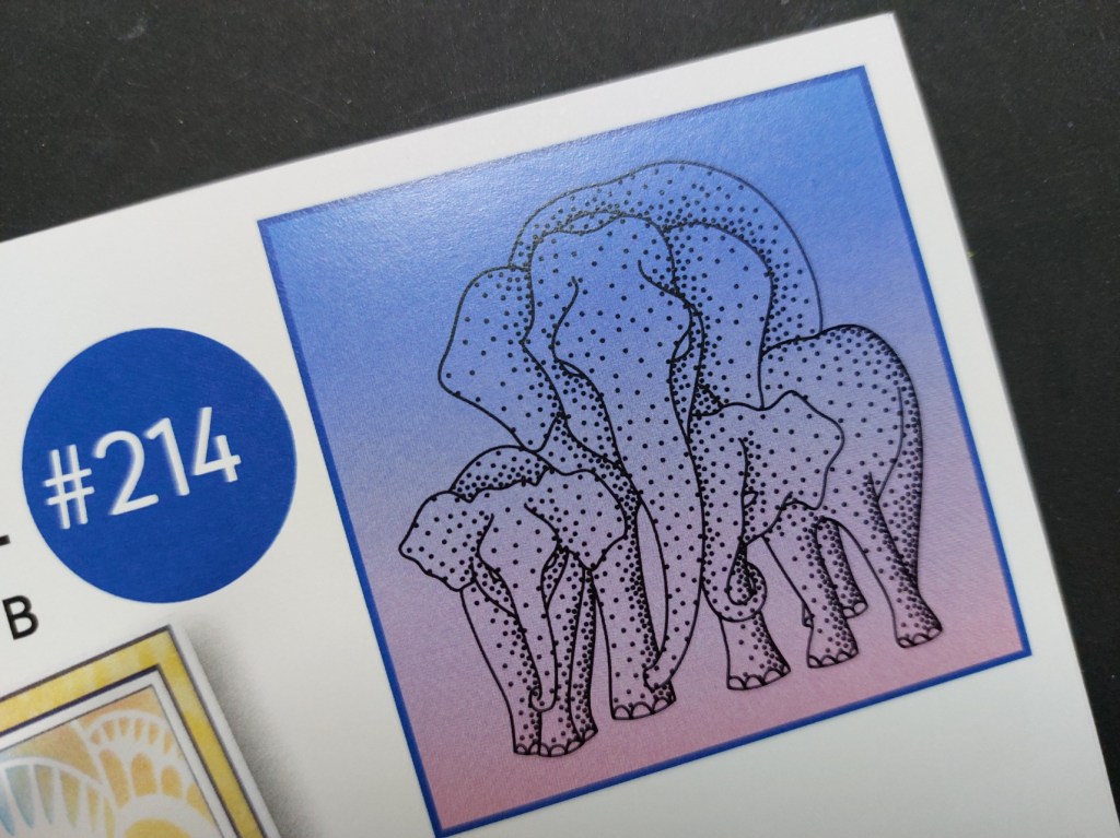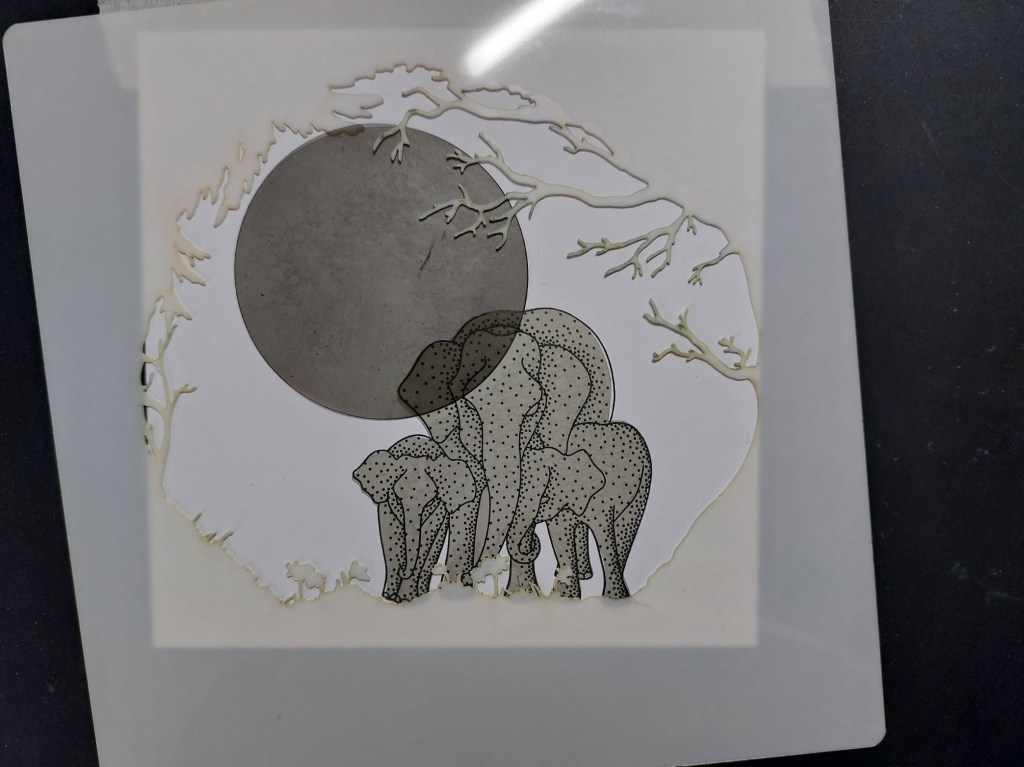 I swept ‘walnut stain’, ‘festive berries’ & ‘ripe persimmon’ Distress Oxides across the stencil with Clarity brushes to create the background. Leaving the mask on the elephants, I lifted the circle off and lightly swept a little more of the ‘ripe persimmon’ across the sun (I didn’t add any more ink to my brush). I then removed the elephants’ mask and shaded them in with grey Poloychromo pencils – it’s easy to get the shading on the image, as I just used the darker greys where there were more dots on the image.