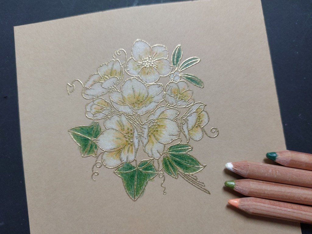 I do love the effect of pencil colouring on kraft card – I started by heat embossing the ‘Chrisstmas rose’ image in gold and then used a combination of Pergaliner pencils to shade in the flowers.