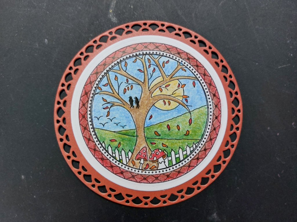 I started by stamping the scene and the circle frame onto a piece of stencil card using black Archival ink. I coloured the image and frame with Pergaliner pencils, then cut it with a nested circle die and added a mount of Toscana companion paper cut with a ‘scallop’ circle doodle frame-it panel die.