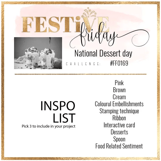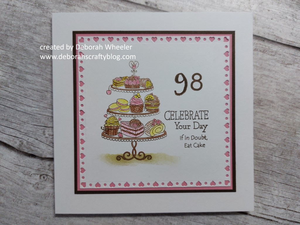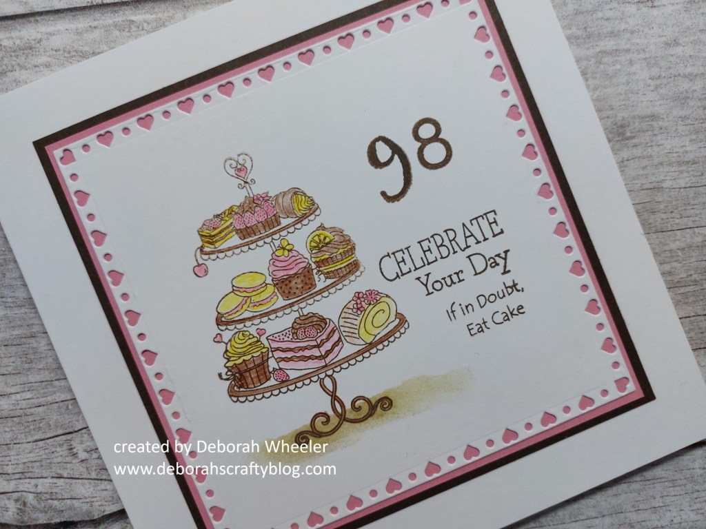Hello there! It’s time for our new theme at Alphabet Challenge and Dawn has given us N for Numbers. I decided to use this opportunity to get ahead of the game (for once…) and make my former mother-in-law’s birthday card – she’ll be 98 in a few weeks time! She’s housebound now, but is very partial to a sweet treat so ‘Linda’s piece of cake’ stamp set from ClarityCrafts fitted the bill perfectly! Helpfully, Festive Friday are marking National Dessert Day (who knew?), and I took pink, brown, desserts and food-related sentiment from their inspo list. The palette from Creative Colour was perfect for this selection of cakes and I’m also joining the ‘celebrate’ theme at Seize the Birthday.