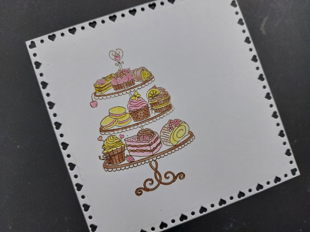 So, onto my process… I cut a square of card using one of the ‘hearts’ nested doodle frame-it panel dies and stamped the cake stand onto it with ‘potting soil’ Archival ink. I then set about colouring all the yummy delights with Pergaliner pencils.