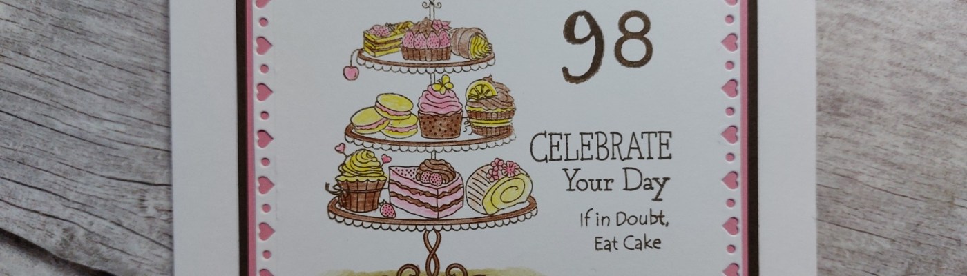 Hello there! It’s time for our new theme at Alphabet Challenge and Dawn has given us N for Numbers. I decided to use this opportunity to get ahead of the game (for once…) and make my former mother-in-law’s birthday card – she’ll be 98 in a few weeks time! She’s housebound now, but is very partial to a sweet treat so ‘Linda’s piece of cake’ stamp set from ClarityCrafts fitted the bill perfectly! Helpfully, Festive Friday are marking National Dessert Day (who knew?), and I took pink, brown, desserts and food-related sentiment from their inspo list. The palette from Creative Colour was perfect for this selection of cakes and I’m also joining the ‘celebrate’ theme at Seize the Birthday.