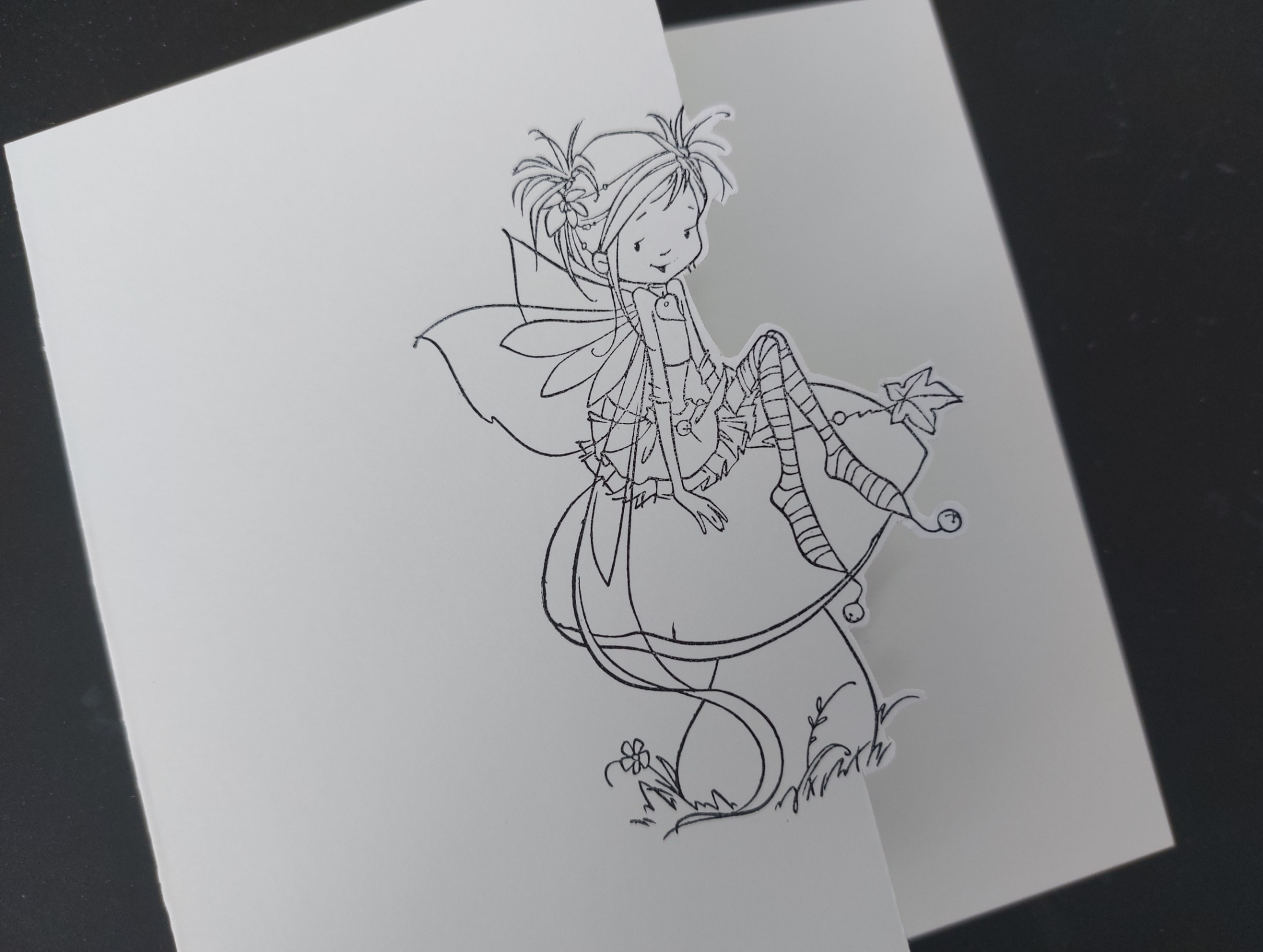 So, let me talk you through the process for this card. I started by stamping Mandy with black Archival ink onto a 5×5 card blank. I used a paper trimmer to cut the card front down to the top & bottom of the image and then fussy cut around the outer edge. I used my Pergaliner pencils to shade Mandy and her toadstool, using a selection of autumnal colours. I kept the colour light where her wings were sitting over the toadstool, to make them look like gossamer.