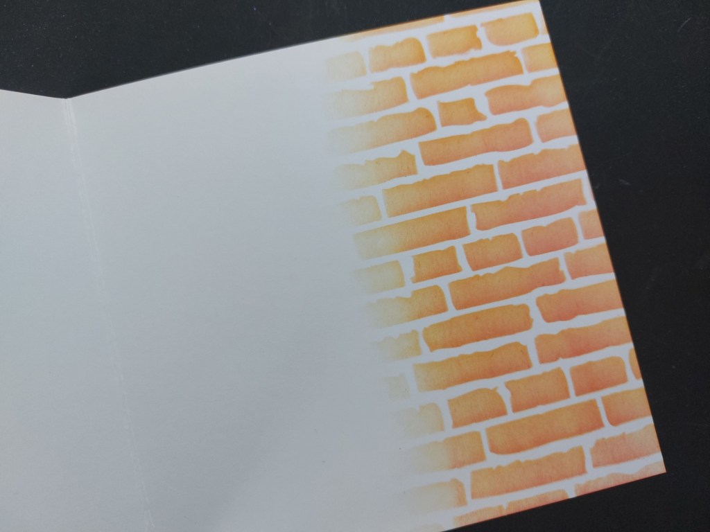I wanted to add a little interest to the edge of the card, so brushed ‘carved pumpkin’ and ‘barn door’ Distress Oxides through the ‘brick wall’ stencil onto the inside of the card, keeping it towards the outer edge.