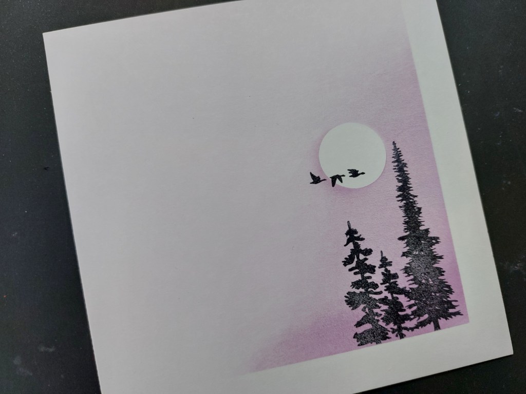 I took a 5×5 card blank and ran masking tape down the right hand side and along the bottom, just to half it’s width. I popped a mini moon mask in place and then swept ‘dusty concord’ Distress Oxide in from the right hand side with a stencil brush. I lifted the mask, stamped a few trees from the set with black Archival ink, added the little birds and then removed the masking.