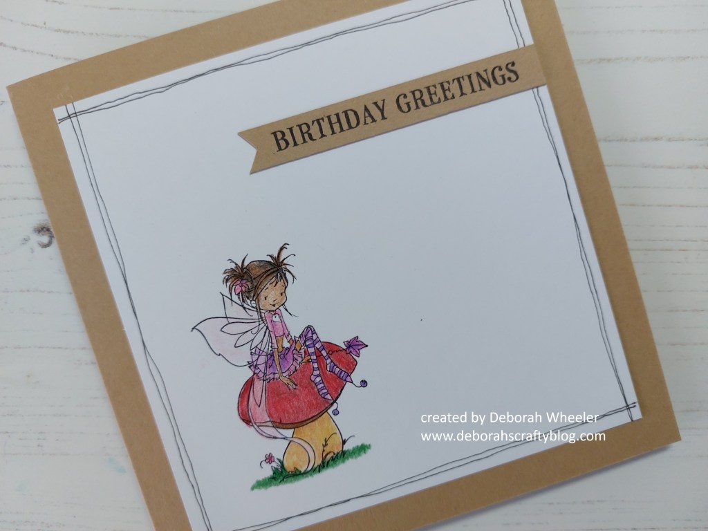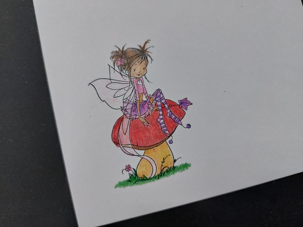 Here I am back with another of the new Sprite Poppets stamps from ClarityCrafts – it’s Mandy, who you’ve met before, but this time she’s mini sized! Thankfully she’s still perched on her toadstool, which makes her perfect for our new theme of ‘toadstools or mushrooms’ at Sparkles Challenges and she’s also off to make an appearance in the gallery at Seize the Birthday.