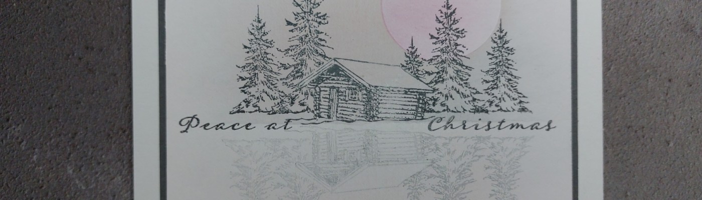Starting with a square of white card, I stamped the cabin with grey ‘watering can’ Archival ink then added the reflection image using the same ink but in second generation (that is, I stamped it off on scrap paper first, then stamped it onto the card so it’s a paler image). I popped a moon mask in place, took a torn piece of copy paper and laid it across the base of the cabin, then brushed a little ‘weathered wood’ around the cabin and added ‘spun sugar’ into the sky (difficult to see in the photo – it’s more pink in real life!). I lifted off the moon mask, replaced it with the outer part and blended ‘picked raspberry’ for a winter sun.
