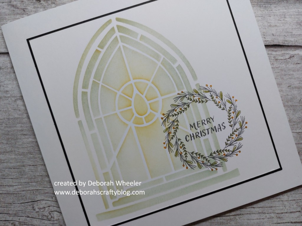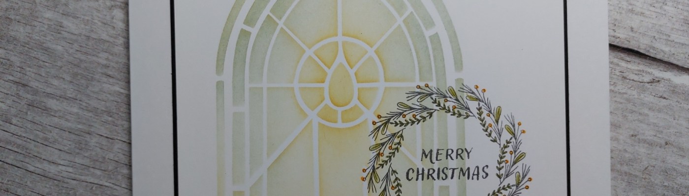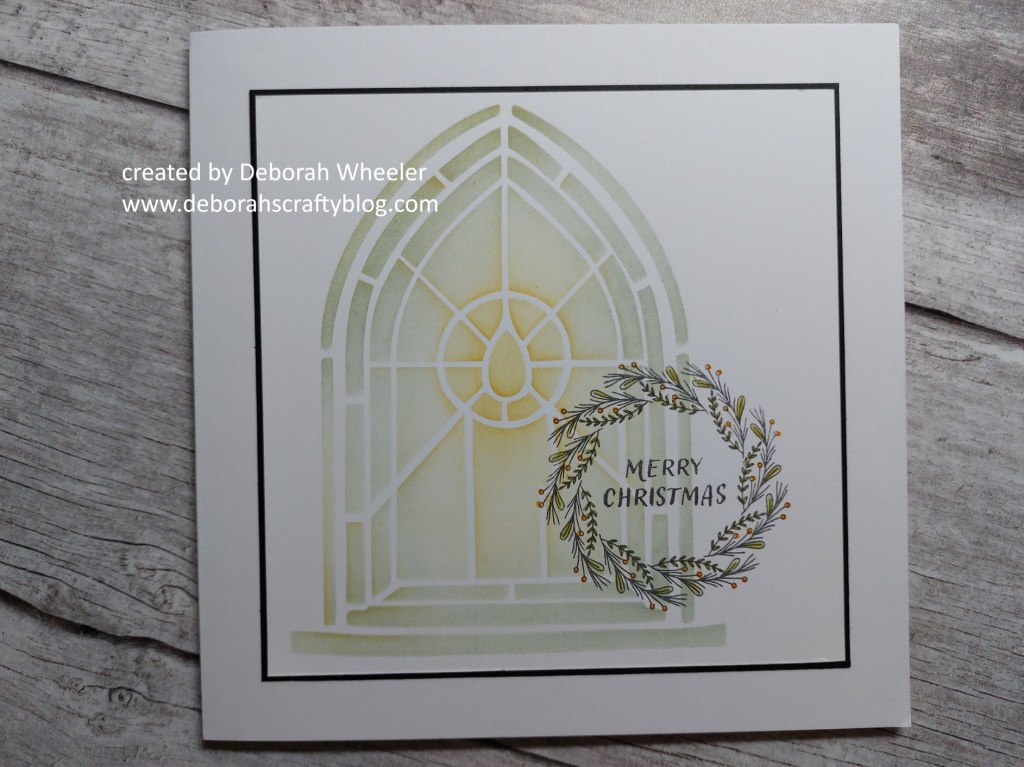 Hello friends and welcome to Sunday’s blog! I’ve got another look at one of ClarityCrafts‘ Christmas window stencils from Friday’s shows, this time paired with one of the ‘KISS Christmas wreaths’ stamps. I’ve channelled my inner Eileen Godwin on this design – she’s an absolute master at combining stencil & stamp images! I also picked up the ‘wreath’ theme from Inspired by and the ‘anything goes’ option from Stencil Fun