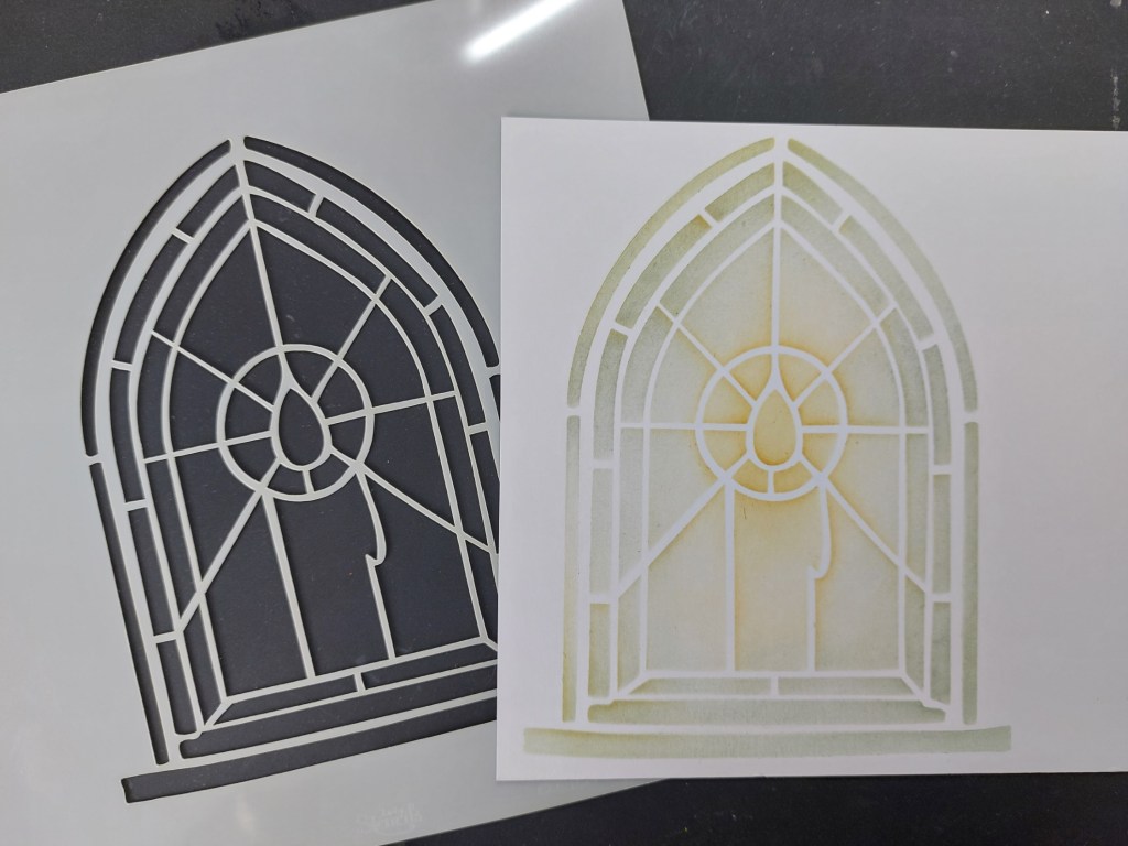 So, here’s what I did. I strated with a 6×6 piece of stencil card, attached the ‘candle window’ stencil to it (positioning it off centre to the left) and brushed ‘iced spruce’ and ‘wild honey’ Distress Inks through it.
