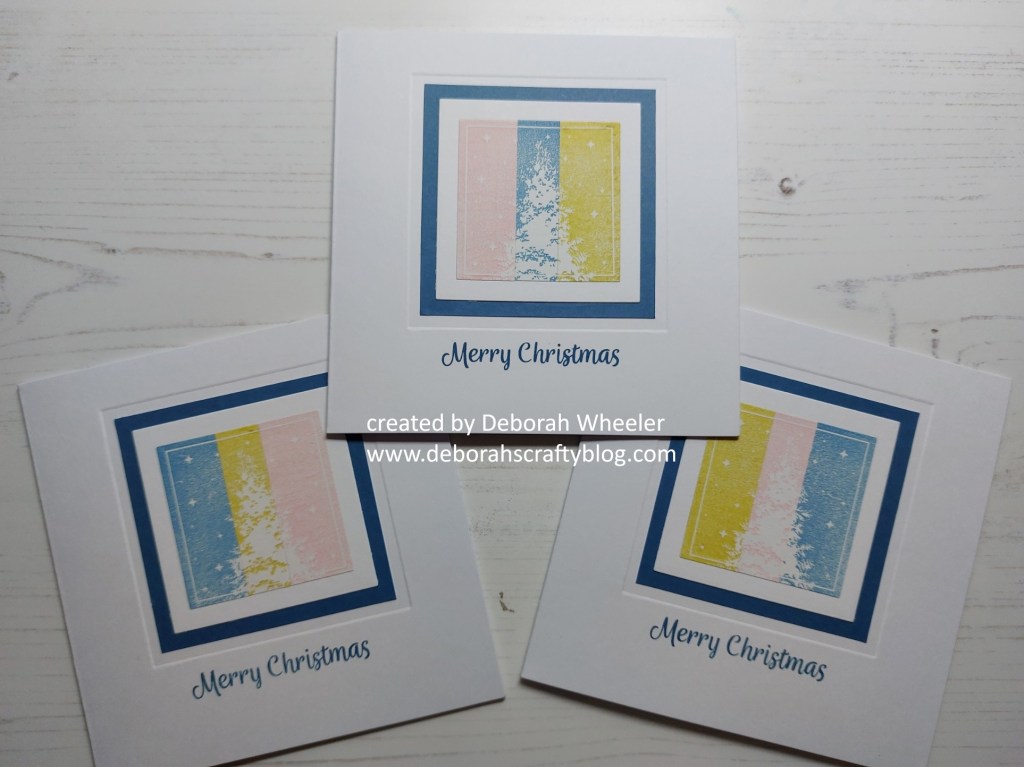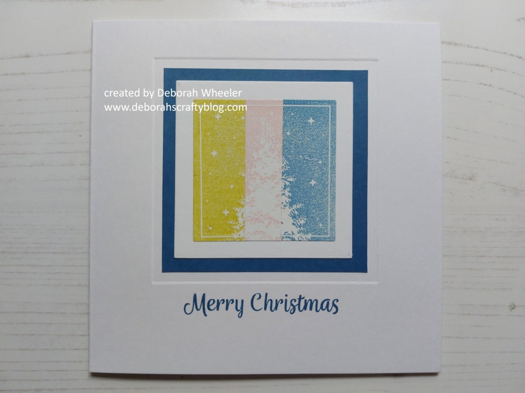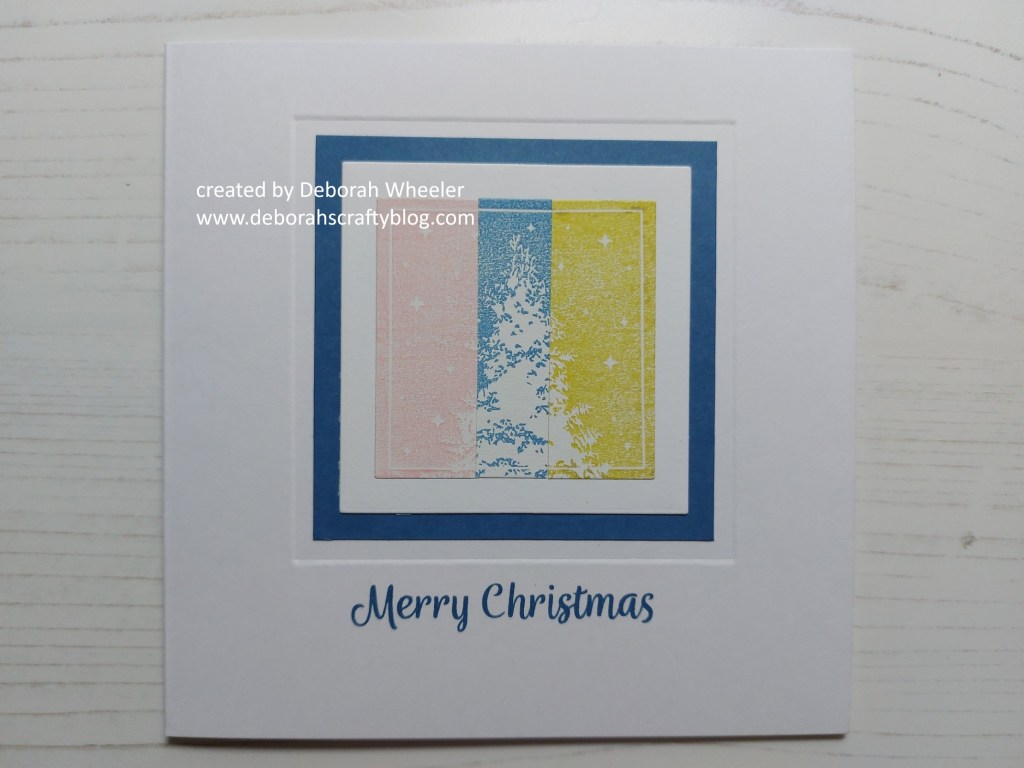 Hello there. I’m back today with another take on the tree stamp from ClarityCrafts‘ new ‘Just Christmas silhouette framer’ set. This time I’ve taken a bit of a collage technique to piece together three separate stamped images to get thestripes on my card – read on for all the details.