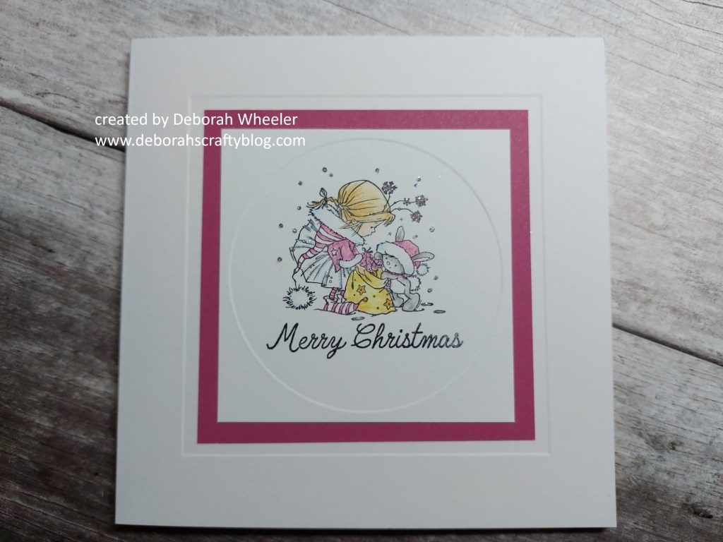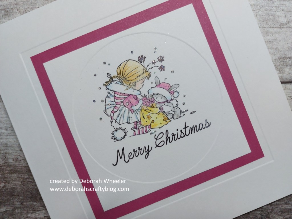 Hello friends and welcome to a busy day on this little blog – there are more cards to come over the day! We’re starting the morning with one of ClarityCrafts‘ gorgeous mini Christmas Poppets stamps – meet Pumpkin and her little bunny pal! I couldn’t resist this little pair for our new ‘P for Party’ theme over at Alphabet Challenge, busily packing their presents into the sack ready for a Christmas celebration and it picked up the pink sparkly snowflakes feel of the image on Hand Stamped Sentiments‘ moodboard.