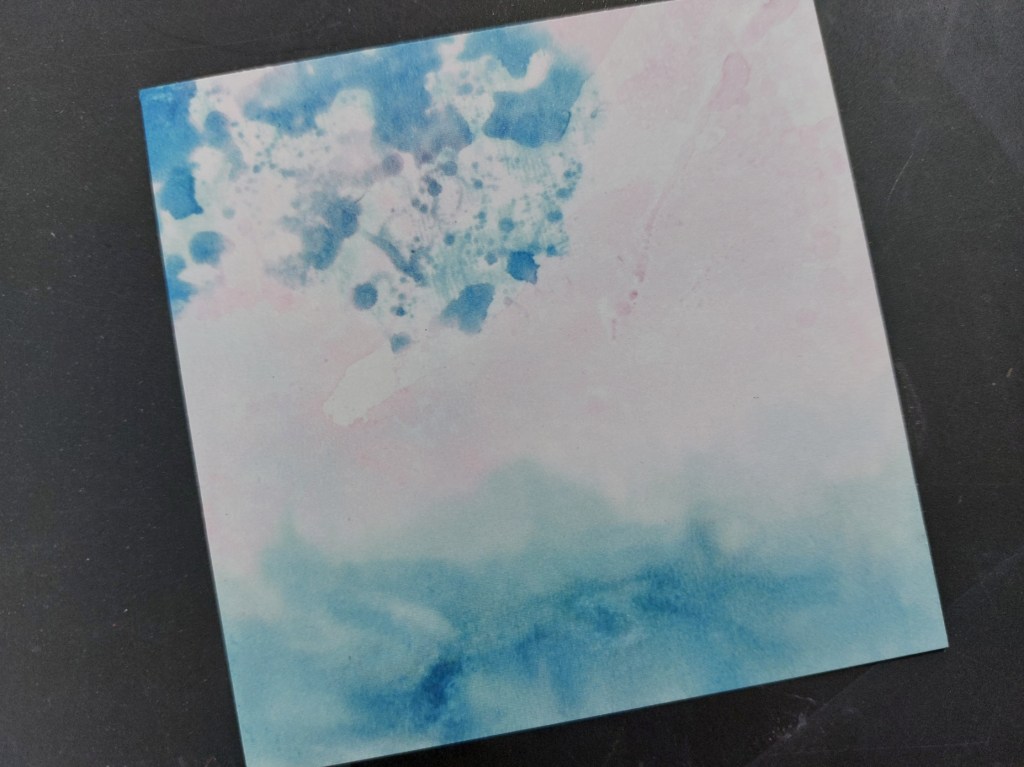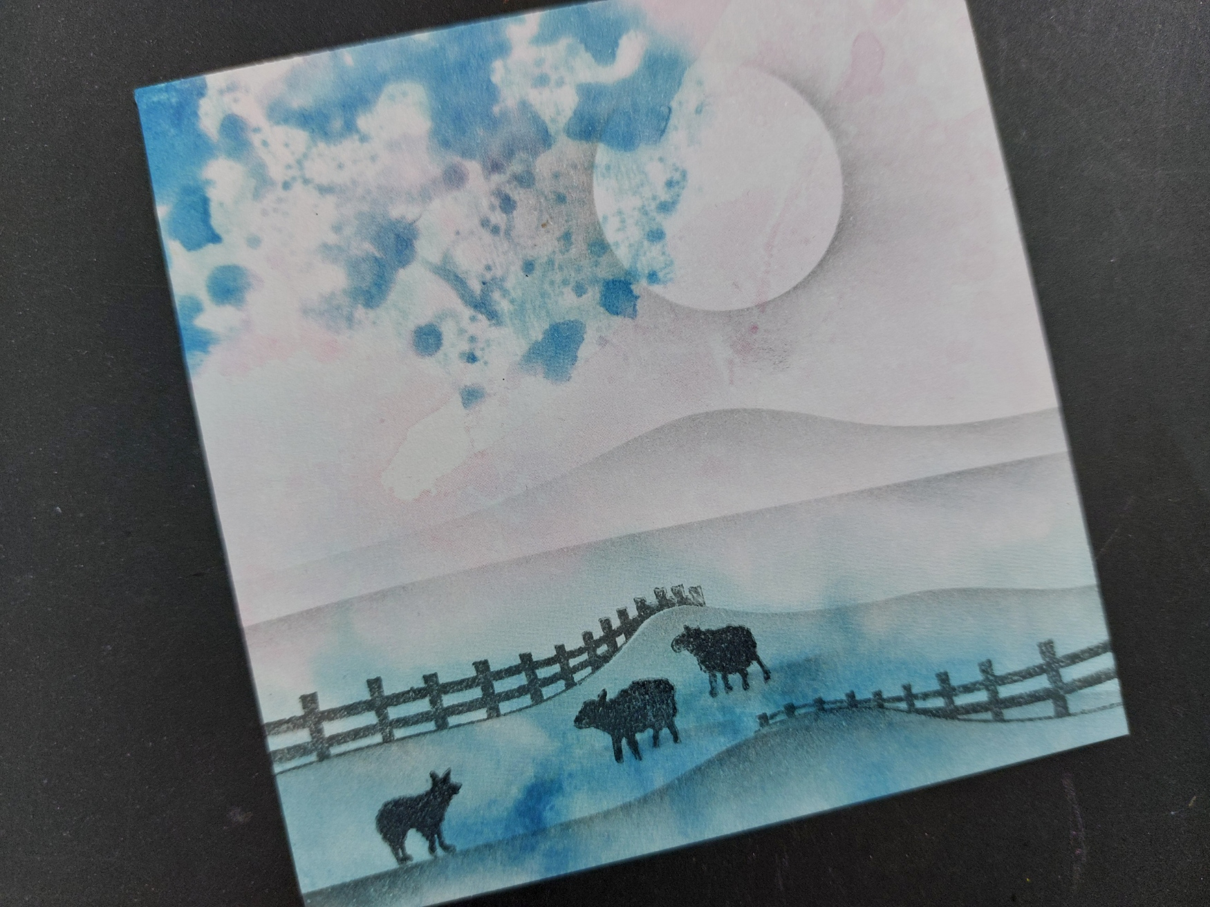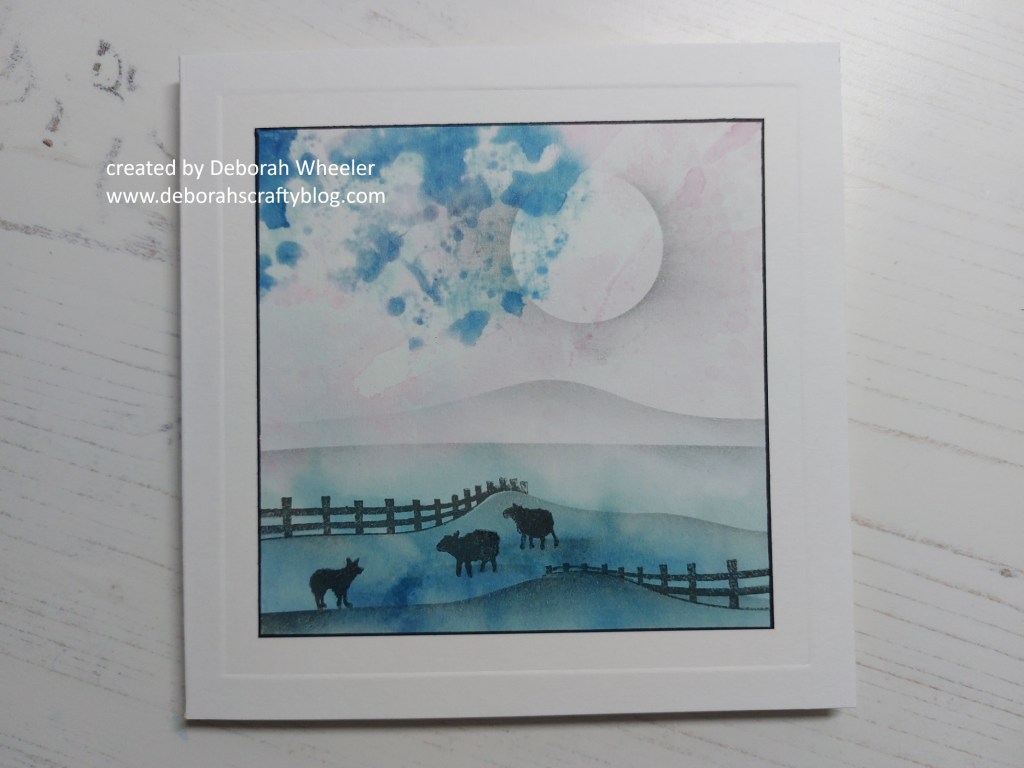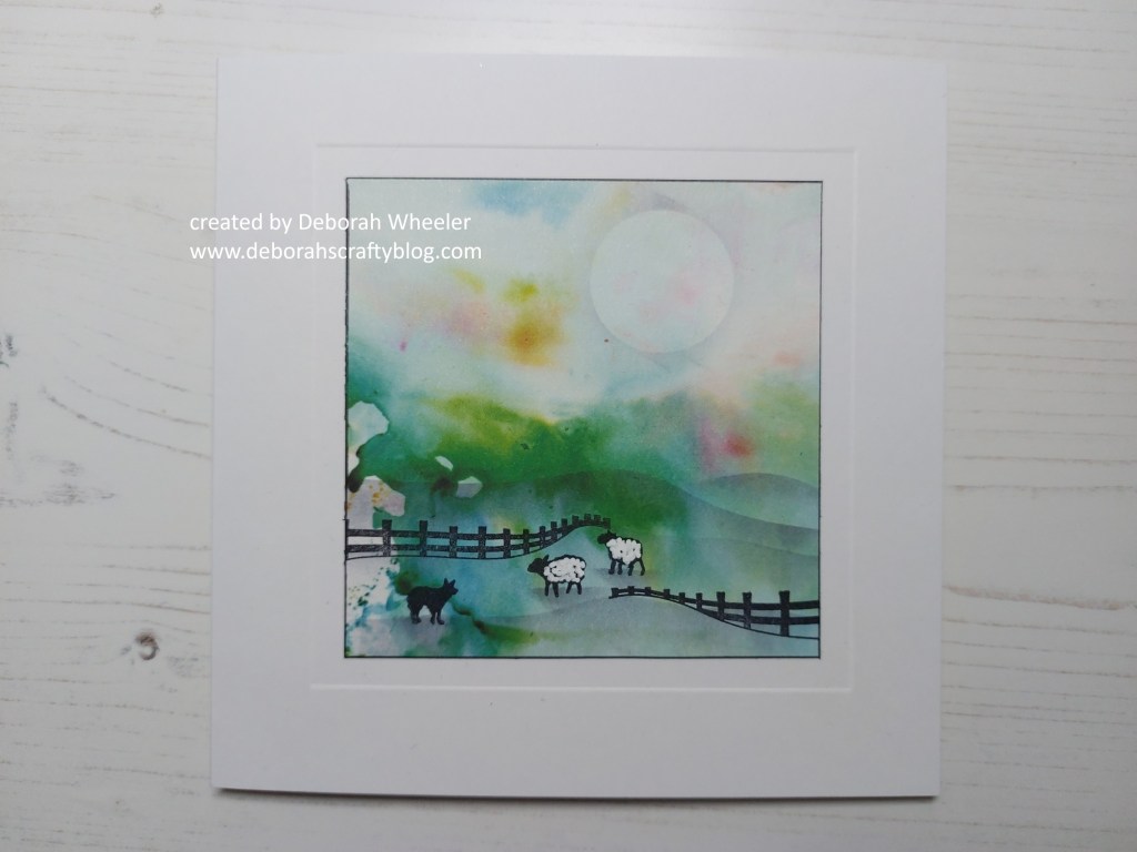 This is a great design for using up offcuts of designer paper – I happily worked my way through a number of pieces over the weekend, just cutting them to a square shape! Having chosen my paper (it helps to pick a piece you think you can see a landscape in), I lined up the lower masks from the set onto it. I then simply removed them one at a time, working from the bottom upwards, and sponged black Archival ink across the edge of the masks, to create shadows in the ladscape. I also popped the moon mask into the sky area and sponged a little of the back ink across it – that darkens the surrounding area, making the moon/sun look lighter. Once all the shading was done, I stamped the fences into place, followed by two of the sheep and the little sheepdog.