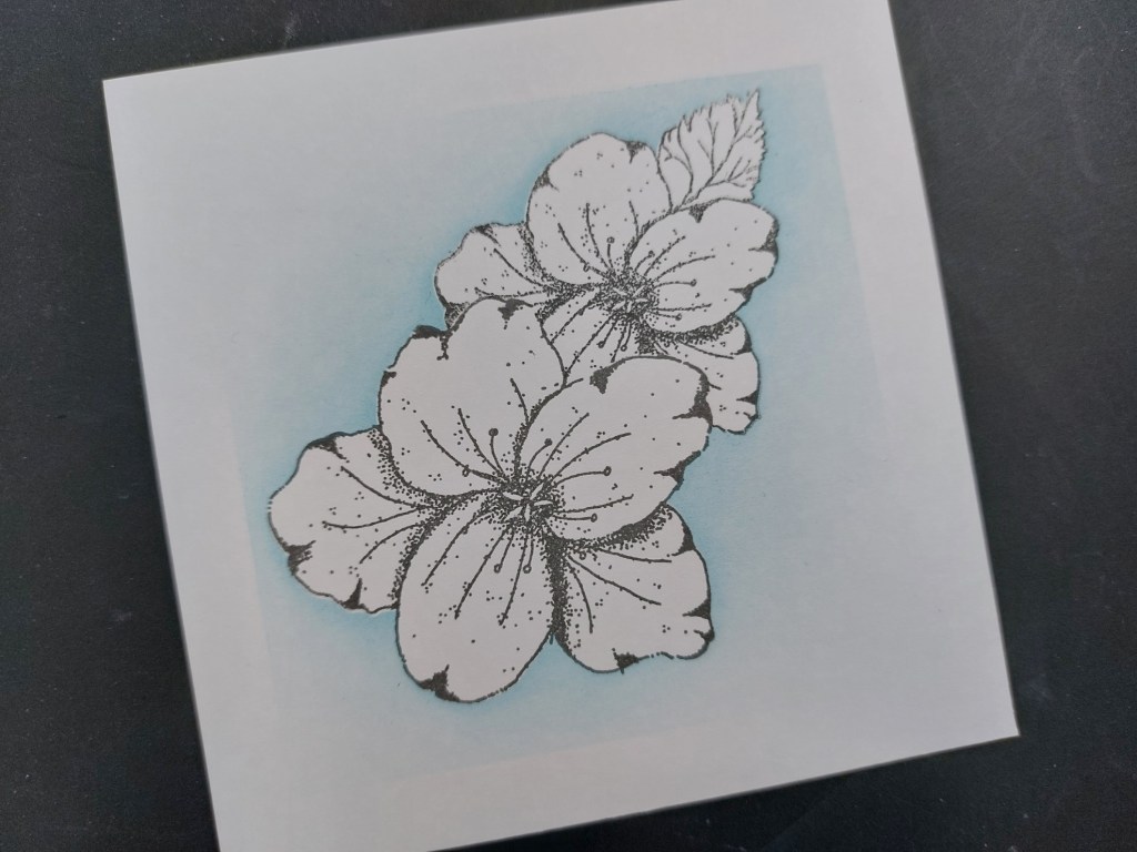 I stamped one of the larger hellobores (Christmas rose) onto a square of stencil card using ‘watering can’ Archival ink, covered it with the pre-cut mask that comes with the set, and stamped the second flower. I masked that one as well, used low tack tape to mask off a border around the edges and brushed ‘broken china’ Distress Oxide into the background.