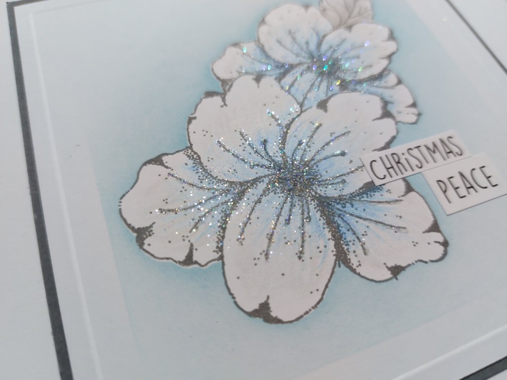 I added a mount of grey card and attached it to a 6×6 card blank. The final touch was to highlight the liens on the flowers with a Quickie glue pen so that I could give them a Christmas sparkle with Pergaglitter, finishing with a couple of the KISS word stickers.