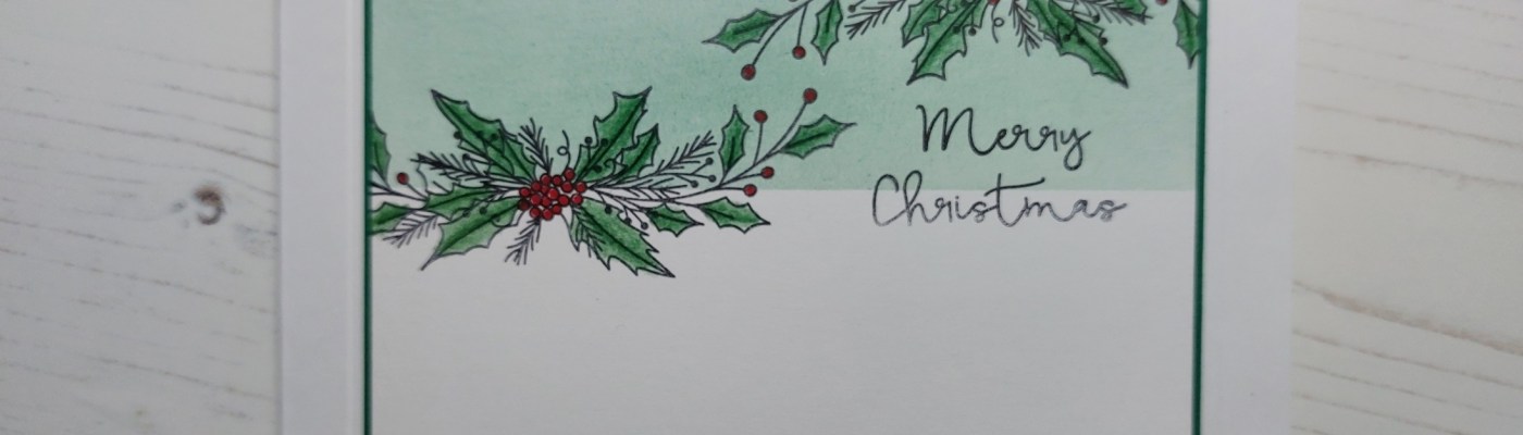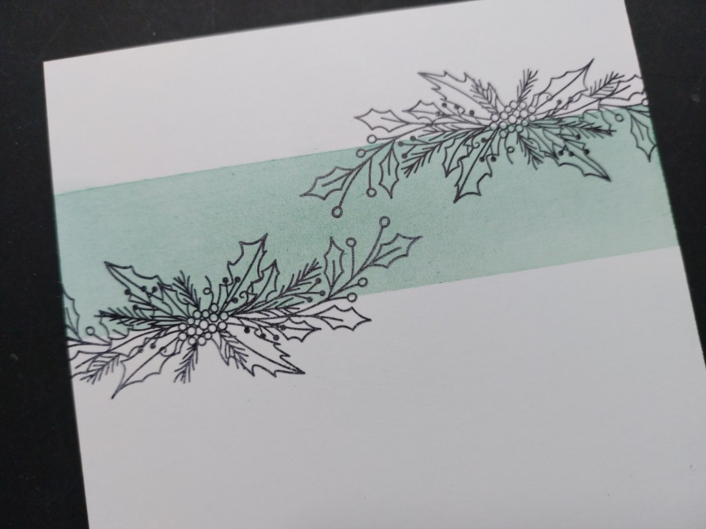 I cut a piece of stencil card to fit on a 6×6 card blank, masked off a panel with low tack tape and brushed ‘pine needles’ Distress Ink across it. After removing the tape, I stamped the holly spray on either side of the inked strip, then coloured the leaves with a green Pergaliner pencil and dotted the berries with a red Pergacolour pen.