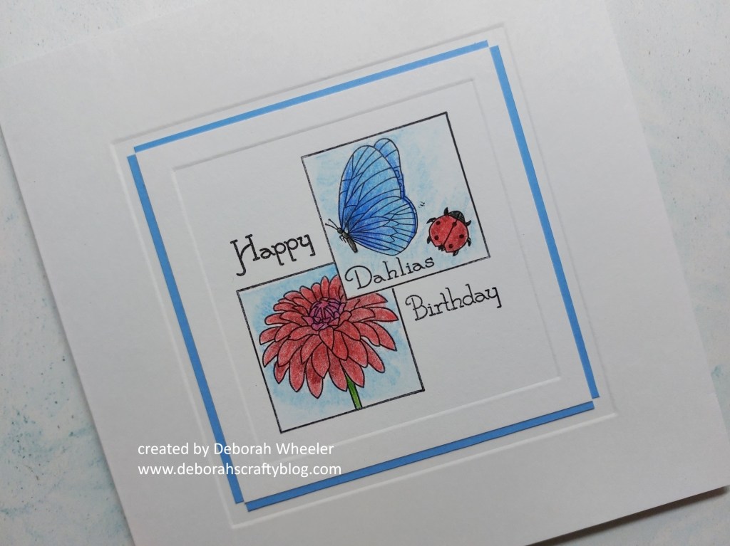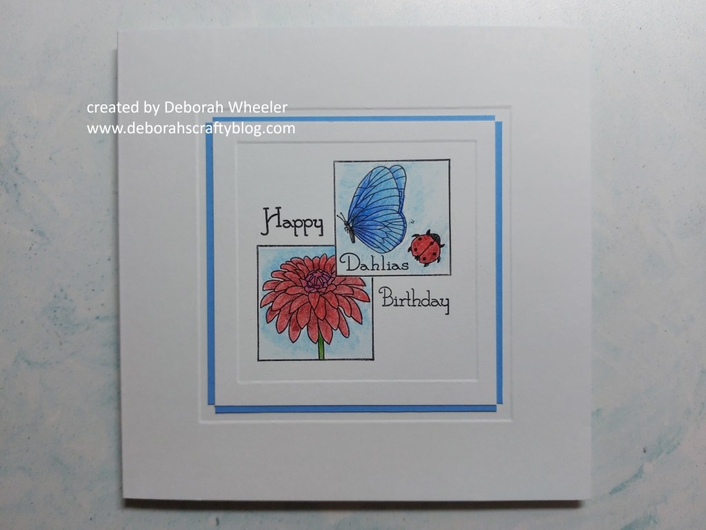 Now you know I love a bit of masking! I discovered that the second smallest of Clarity’s nested square dies is a perfect fit for all their square sampler stamps, so cut myself a few masks from their blank mask material. I stamped the butterfly & ladybird image onto a small square of stencil card, covered them with one of my masks and then stamped the dahlia image to sit behind them, before colouring them with Pergaliner pencils.