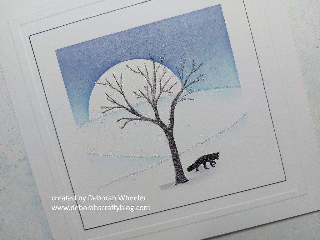 Having removed all the masks, I could stamp the tree and fox with black Archival ink, sponging a little ink across a piece of tirn copy paper to add a graound shadow below both of them. I edged the topper with a black Sharpie and attached it to the card front. The finishing touch was to run a Quickie glue pen along the tree branches and the snow drifts, then scatter ‘hint of blue’ Perga glitter across it to give a lovely frosty effect.
