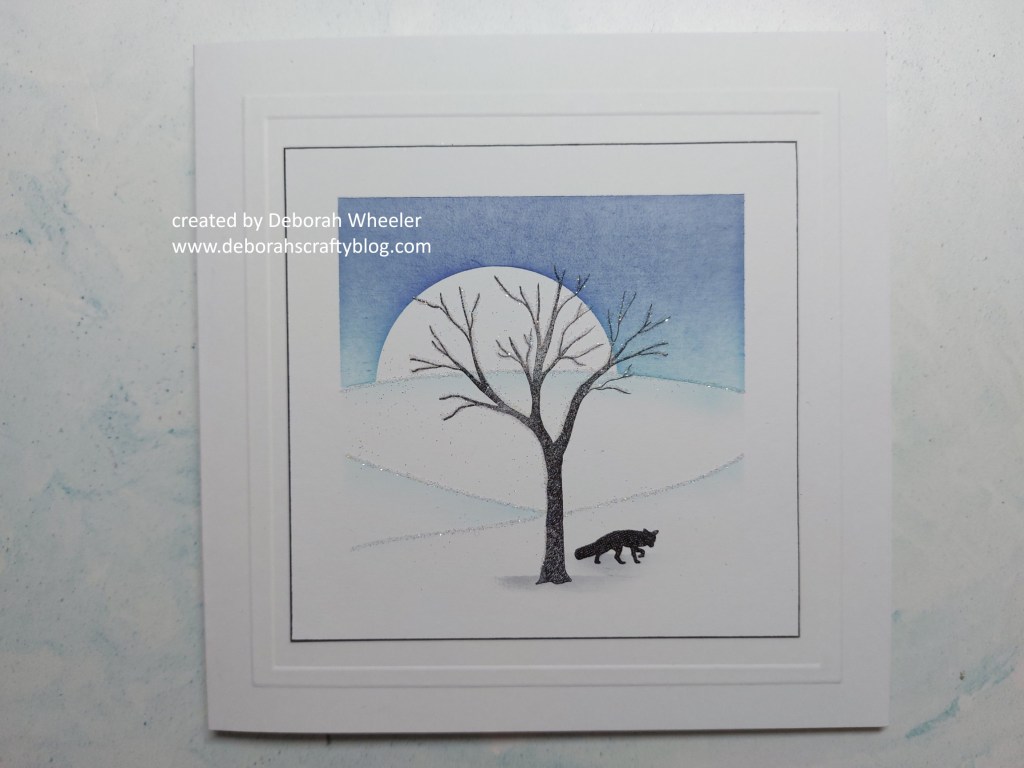 Hello there! I just had a memory pop up on my Facebook page from two years ago when we had snow in London that lasted a week – so unusual! There’s no sign of that this year though, so here’s a snowy creative offering for you with one of the designs that I demonstrated at last month’s ClarityCrafts Open Days using the woodland treescape stamp & mask set. I’ve used these masks quite a few times since they launched, but I just love them! My little fox in the snow scene picks up the blue tones from Color Dare and the chilly theme from Addicted to CAS.