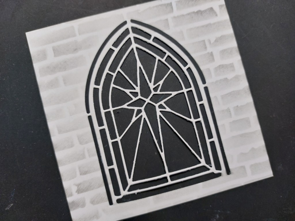I started by cutting the die into the centre of a piece of stencil card, then laid the ‘brick wall’ stencil over it and lightly brushed ‘hickory smoke’ Distress Oxide in from either side, so as not to stencil over the die cut.