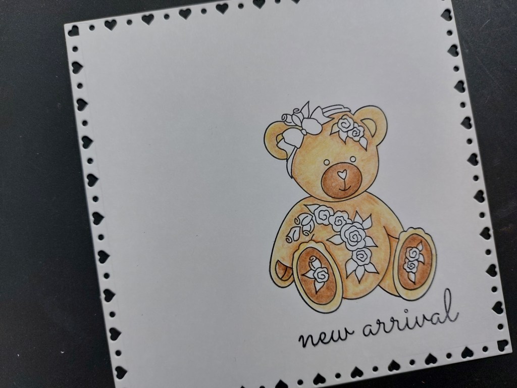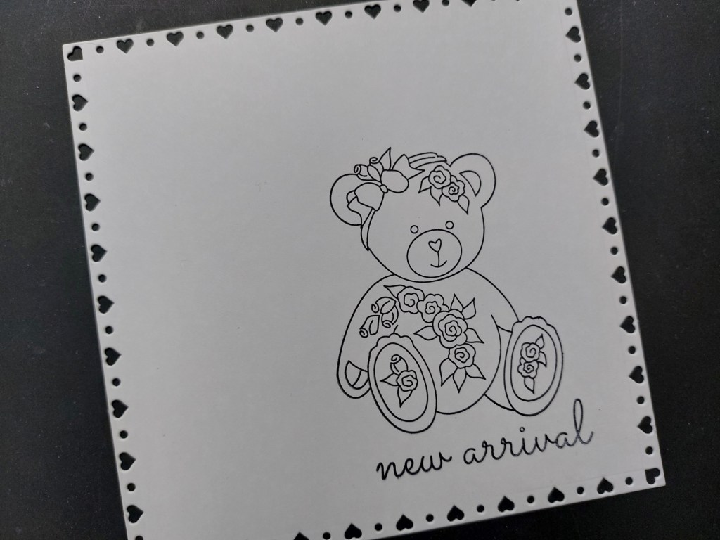 Hello there. It’s the final few hours of ClarityCrafts‘ bumper sale, featuring huge discounts on the back issues of their monthly Craft Club. It ends at midnight UK time, so I thought I’d get a stamp from earlier this year into action as a final temptation – I have to confess the ‘rose teddy’ hadn’t seen ink until now (in my defence it did arrive just before I headed off on my overseas trip with friends). I need some more new baby cards, so what better reason to get it out?