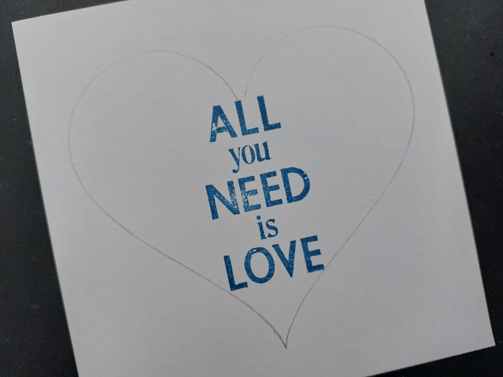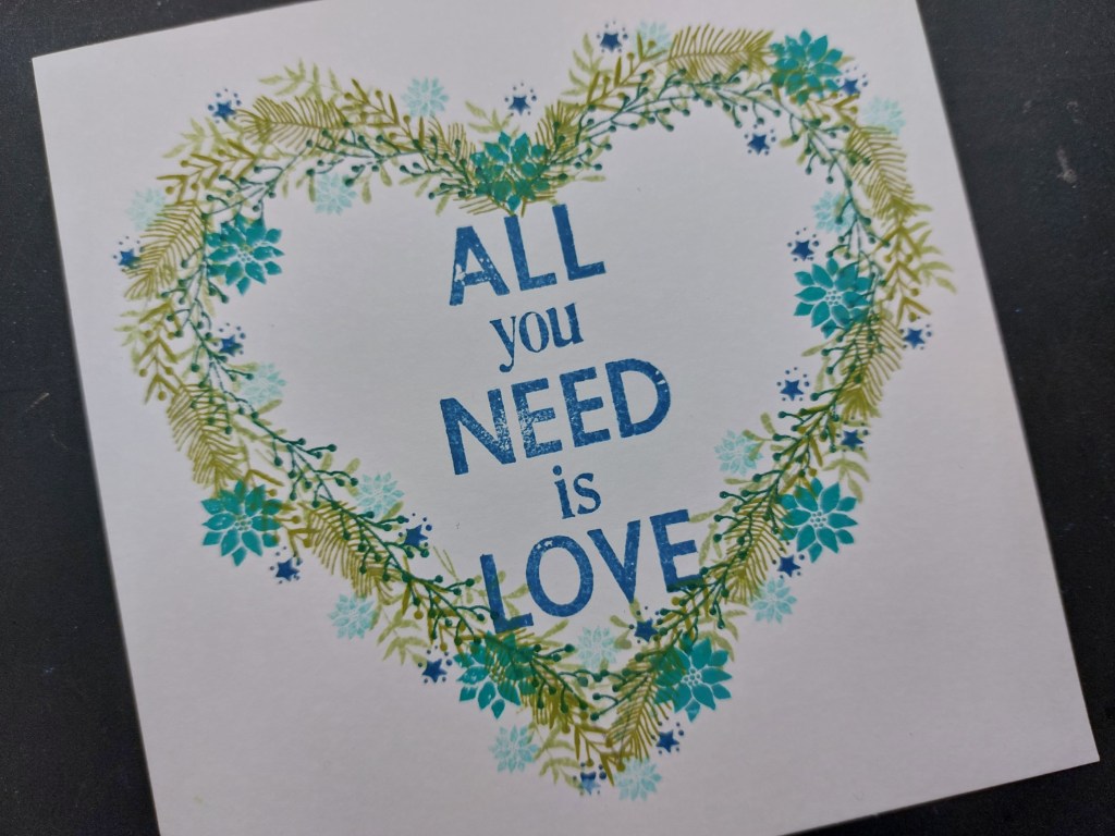 I started by tracing an outline onto a piece of stencil card using the ‘heart shape‘ stencil. I could then position the sentiment from the ‘Quotes set 1‘ stamps using ‘uncharted mariner’ Distress Oxide. The next step was to start building the wreath, so I took two of the leafy stamps and alternated them around the outline of the heart using ‘peeled paint’.