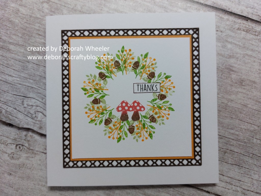 First step was to trace a pencil circle on a 3.5inch square of stencil card. I then stamped two of the leafy springs around the circle at right angles to it, using ‘bundled sage’ & ‘mowed lawn’ Distress Oxides. I then added the berries in ‘carved pumpkin’ and the acorns in ‘walnut stain, followed by a couple of toadstools at the bottom using ‘barn door’ for the caps & ‘walnut stain’ for the stalks.