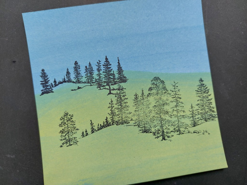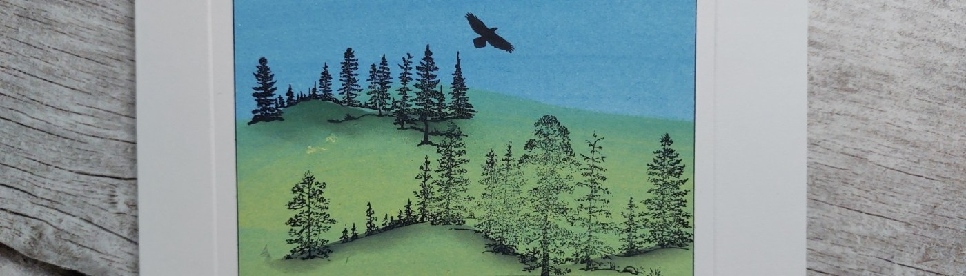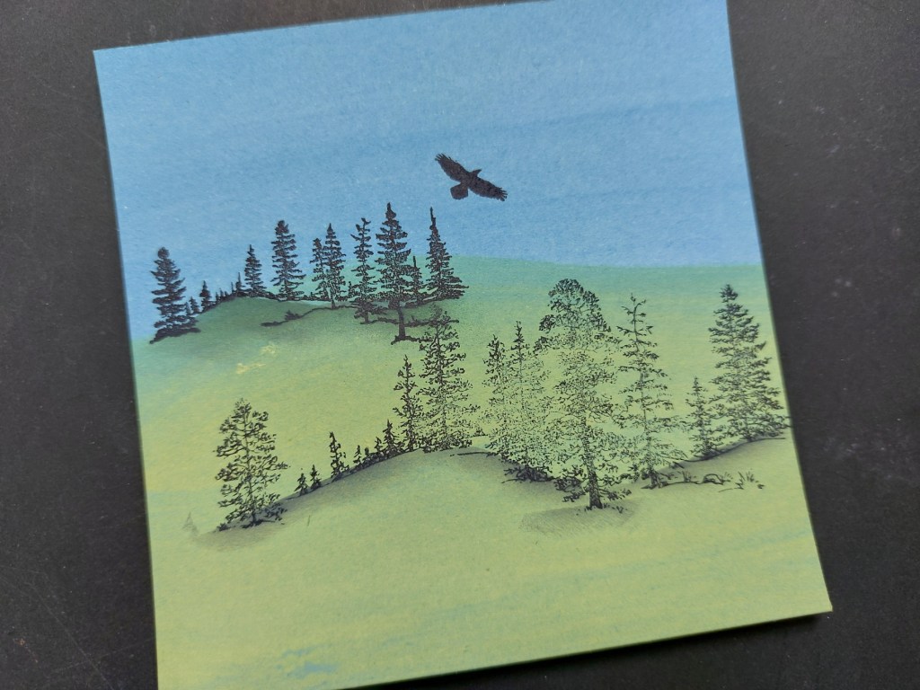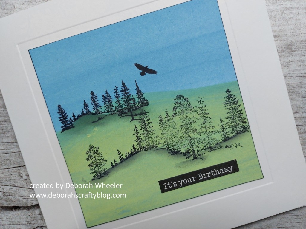 I used a nested square die to cut the card down, then stamped the ‘wild frame’ grove of trees across it with black Archival ink. I added the smaller row of trees from the ‘woodland miniatures‘ set on the horizon, then used low tack tape to cover along the base of the trees (folding it to fit round the curves) and sponged ‘watering can’ Archival to create the shadow. Finally, I popped the small eagle into the sky.