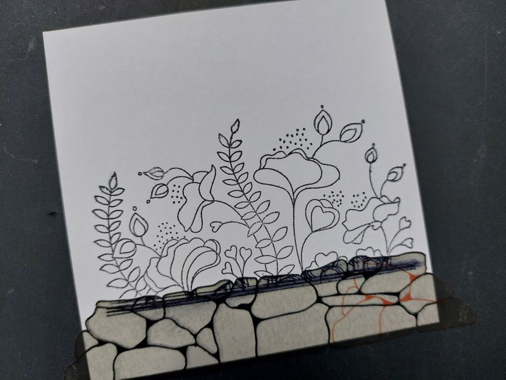So, here’s quick run through on my process. I took one of Clarity’s 3.5inch squares of stencil card and stamped the rockery across the bottom with black Archival ink, sitting slightly over the lower edge. I covered it with the pre-cut mask that comes with the stamps and then added the floral stamp above it, so that the lizzies and friends look like they’re growing out of the top of the rockery.