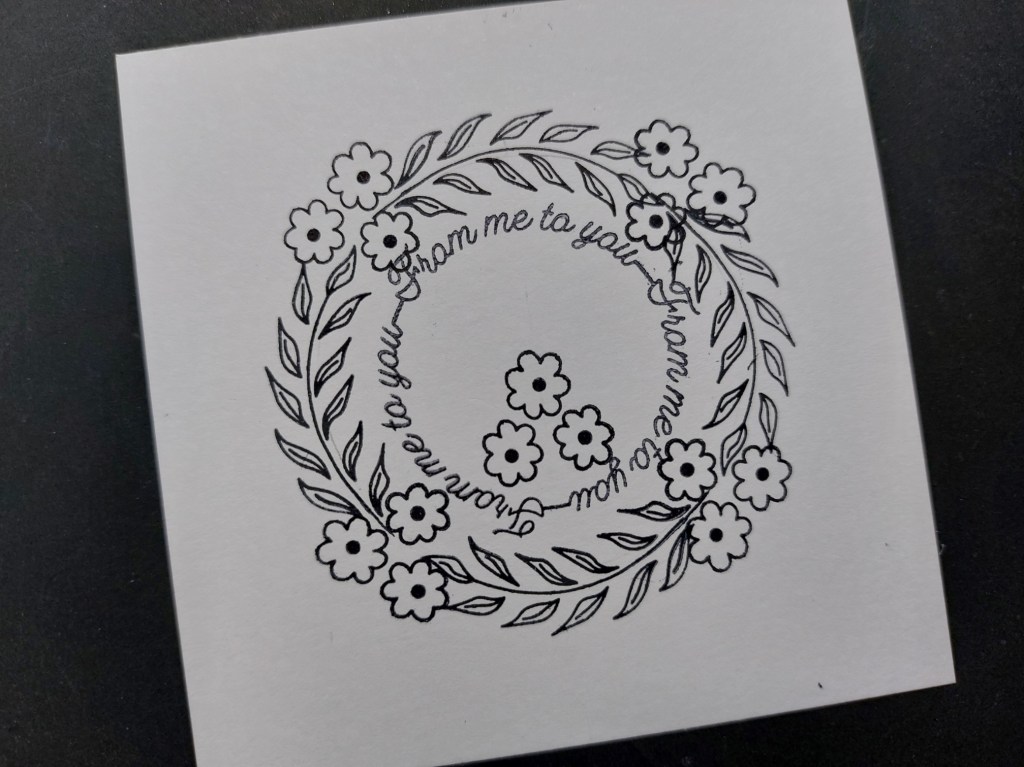 The key thing about this card is lining up and building the wreath (as if…!) I first drew pnecil gridlines on a piece of 3.5inch stencil card, to mark the centre. I could then stamp one of the circular sentiments into place with black Archival ink. Next was to add the leafy spray – I drew round a nested circle embedder to help me line it up and then stamped it four times, aiming the sten and the top of the leaves onto my guidline. Finally, I could add the little trio of flowers, stamping between each of the leafy sprays and one more for luck in the centre!