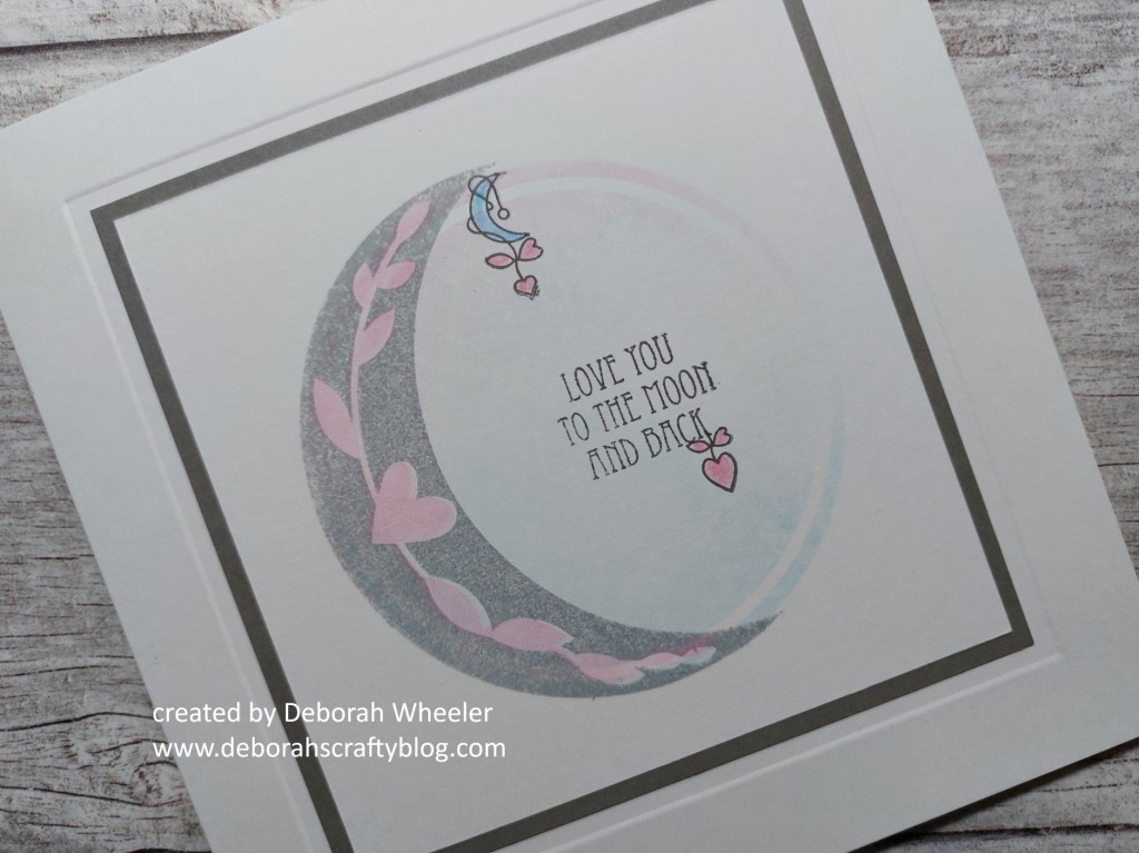 I then took the infill stamp for the hearty design on the crescent, sponged ‘kitsch flamingo’ onto it and stamped it into the grey moon. I find the easiest way to do this is to line up the stamp over the image on the card, then line up my mount with the edges of the card, picking up the stamp on it. That way I can use the mount to guide the stamp back into place once inked, rather than trying to see whether the image is lined up through the ink. I added the sentiment and a couple of the little accent stamps with ‘watering can’ Archival ink, colouring them with a blending nib and some of the ink on my mat from using the brayer.