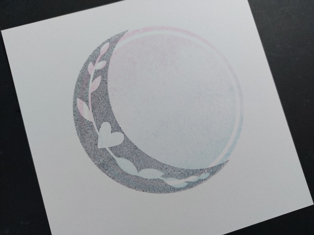 I started by brayering ‘kitsch flamingo’ and ‘broken china’ Distress Oxides onto Clarity’s small circle backdrop stamp (it’s a good way of blending the ink on your stamp) and stamped it onto a piece of stencil card.  I then lined up the solid crescent moon stamp with the backdrop stamp so that the points of the moon were level with the outer edge of the circle. I stamped it over the backdrop using ‘shadow grey’ Archival ink.