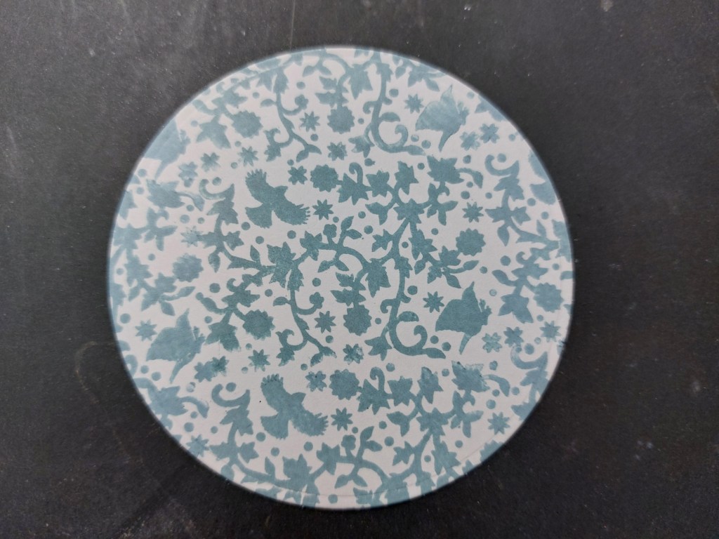 I started with a die cut circle of white card and repeat stamped the image (it’s the one second from the bottom on the right of the stamp sheet) in ‘sky blue’ Archival ink. to cover the circle, I first stamped the full image into the centre then went above, below and to each side, before finally using the corners to fill in the last little bits.