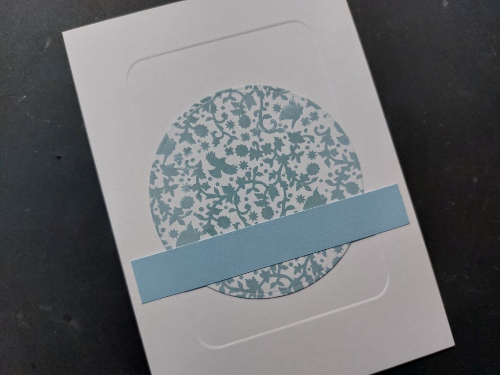 I went for an A6 card blank for this one and embossed one of the rounded corner embedders onto the front first, then added the stamped circle and a strip of Antarctica companion paper.
