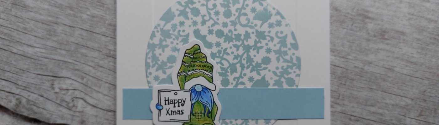 I stamped & die cut the gnome, coloured him with Pergaliner pencils, then added the mini sentiment – the rectangle stamp pen was perfect for this! After gluing a little scrap card onto the back of the gnome for a bit more dimension, he sat nicely on the card front.