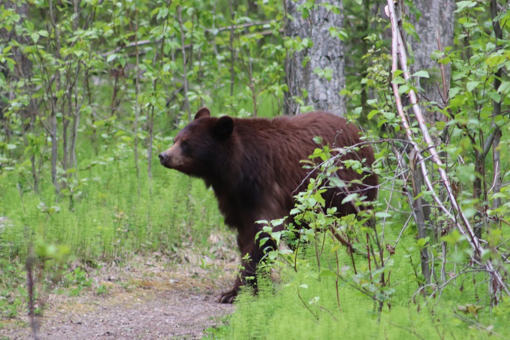 Now, I did mention that these bears resonated with me – and here’s why… I had a brilliant trip with friends last year out to Western Canada, travelling through the Rockies. We had a spare half day in Jasper before catching the train through the mountains so decided to go for a walk around the edge of town. We had not planned to run into a large brown bear coming down the footpath we were heading along, that’s for sure! These photos were taken by my friend over my shoulder (I was unlucky enough to be at the front of our little trio!), while his ever-resourceful wife was busy looking for an escape route (by now we were all walking backwards up the path, as advised in the ‘bear talk’ we’d had in the Visitors’ Centre). She thankfully realised we could scramble up the bank to one side and get between a row of houses, which you won’t be surprised to read is exactly what we did!! It took a little while for our pulse rates to settle, I can tell you, and we weren’t about to hang around for any bear hugs!