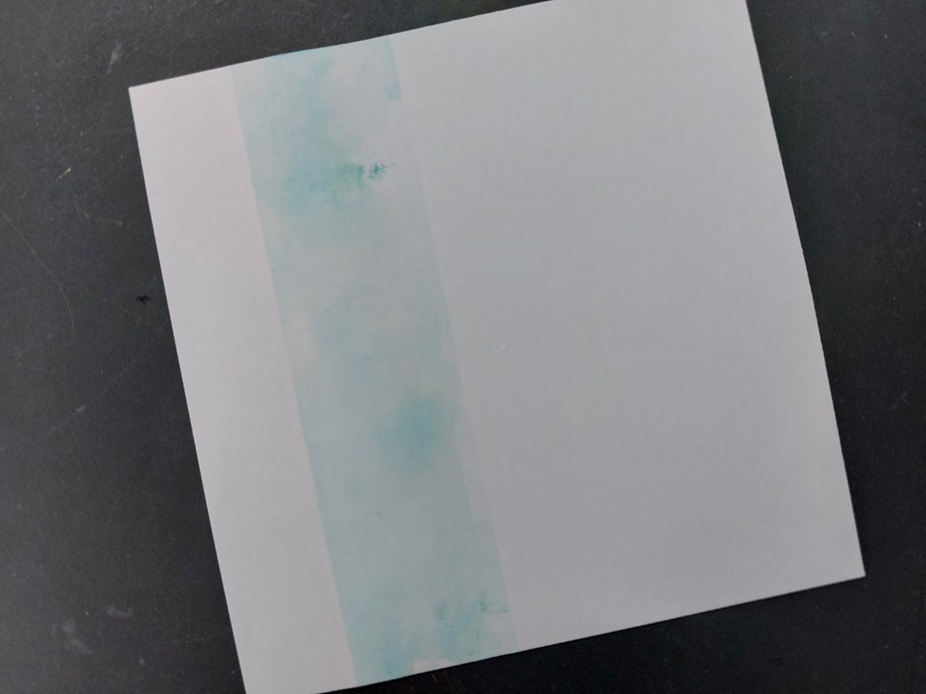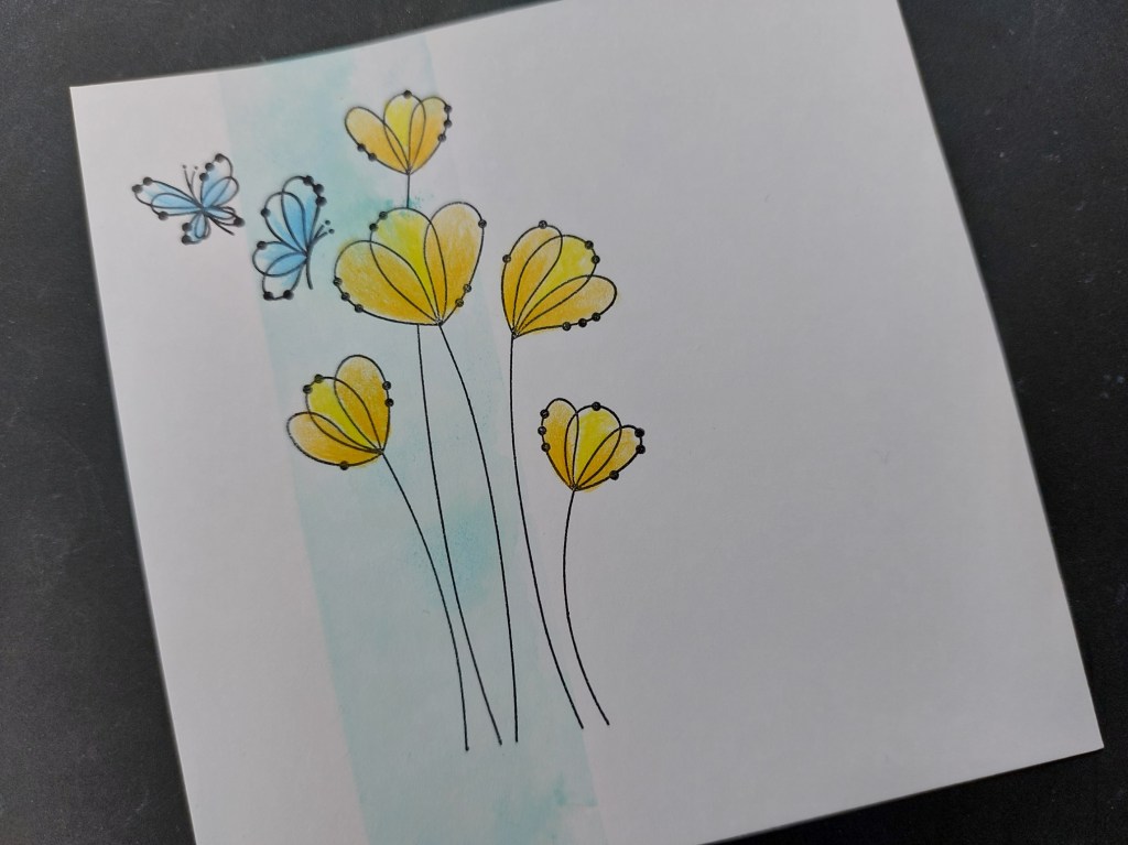 So I started by masking off a panel on a piece of Clarity’s stencil card, squished ‘salvaged patina’ Distress Oxide onto a mix mat, spritzed it with water and then smooshed it onto the card. Once dry, I stamped the flowers and butterflies with black Archival ink (can you see the heart shapes in the flowers?) and shaded them with Pergaliner pencils