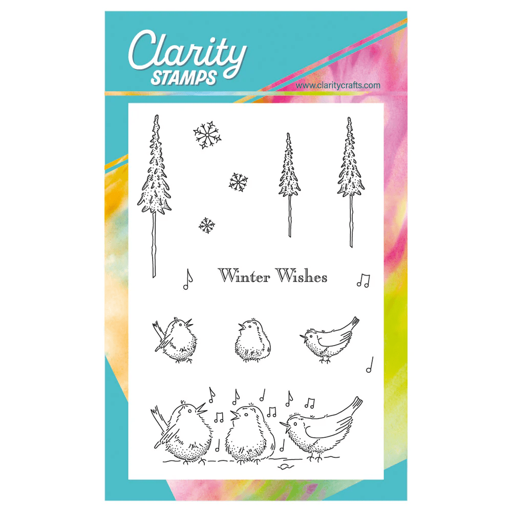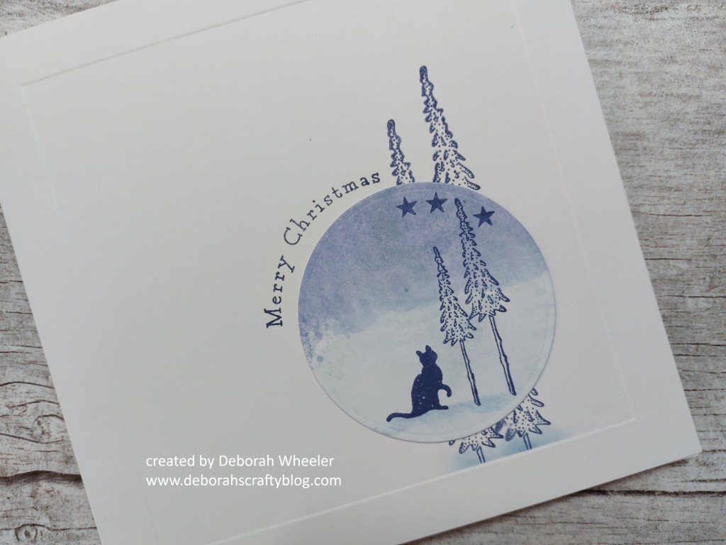 I sponged a little of the blue ink across the base of the trees on the card blank before I removed the masking tape, then glued the topper into place. I finished with three little stars from ‘Linda’s wish upon a star‘ set and the sentiment from the ‘KISS – sentiment rounds‘. These are great semi-circle sentiments, but I only wanted the ‘merry Christmas’ section, so masked it off with low tack tape before inking it then stamped it to sit around the topper.