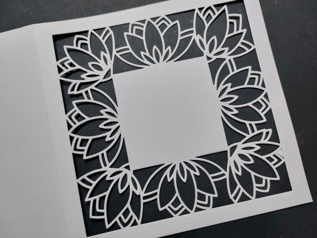 These lovely square dies cut an aperture into the paper (they have no outer cutting edge, so you need to use a nested square die if you want them as a separate topper) but I decided to cut it straight into the front of a 6×6 card blank. It was then an easy matter to cut a piece of Waimea Falls designer paper and glue it to the inside of the card front.