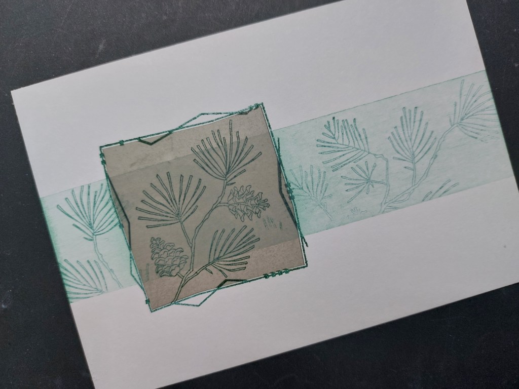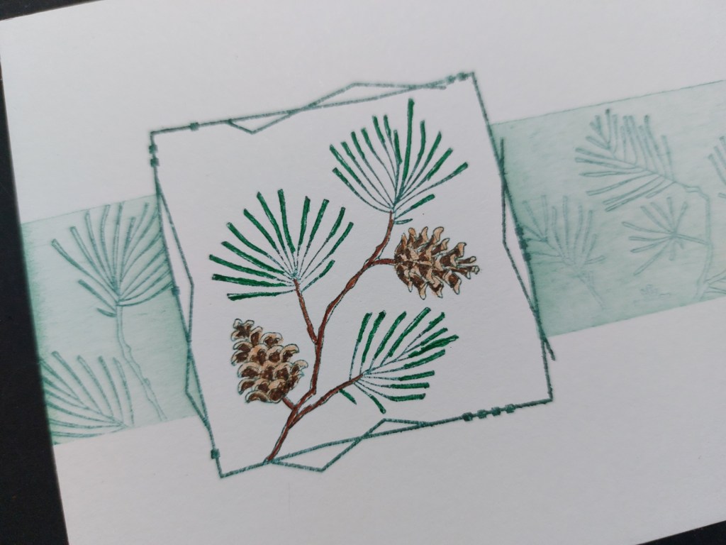 I cut a piece of card to fit on an A6 card blank (I don’t have a mini slimline as suggested on the CAS C&S sketch) and stamped the small pine bough frame onto it using ‘library green’ Archival ink. I covered it with the pre-cut mask that comes with the stamps, ran a couple of strips of low tack tape to mask off a panel and brushed ‘evergreen bough’ Distress Oxide across it. I then stamped the large bough image into the panel, again using the ‘library green’ but this time in second generation (ie I stamped it lightly onto copy paper first before stamping onto the card.)