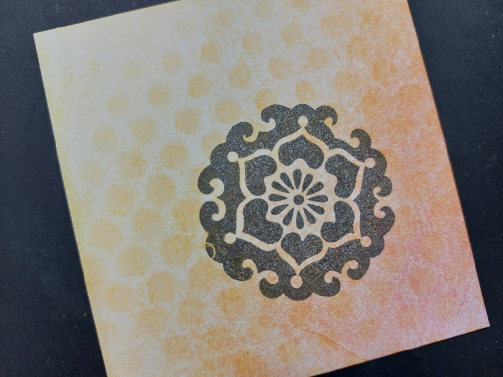 So here’s a quick run through of my process… I started with a small square of stencil card that I’d cleaned my brayer on from a previous project (didn’t writ. on it which inks I’d used, but it looks like ‘festive berries’, ‘carved pumpkin’ & ‘dried marigold’ Distress Oxides). I used the ‘dotty wave‘ stencil and brushed a little of the ‘carved pumpkin’ through it, then stamped the mandala (the middle one of the three) in ‘watering can’ Archival ink.